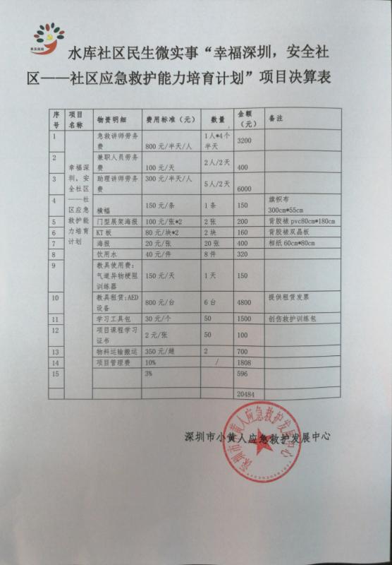 幸福深圳,安全社区——社区应急救护能力培育计划项目决算表