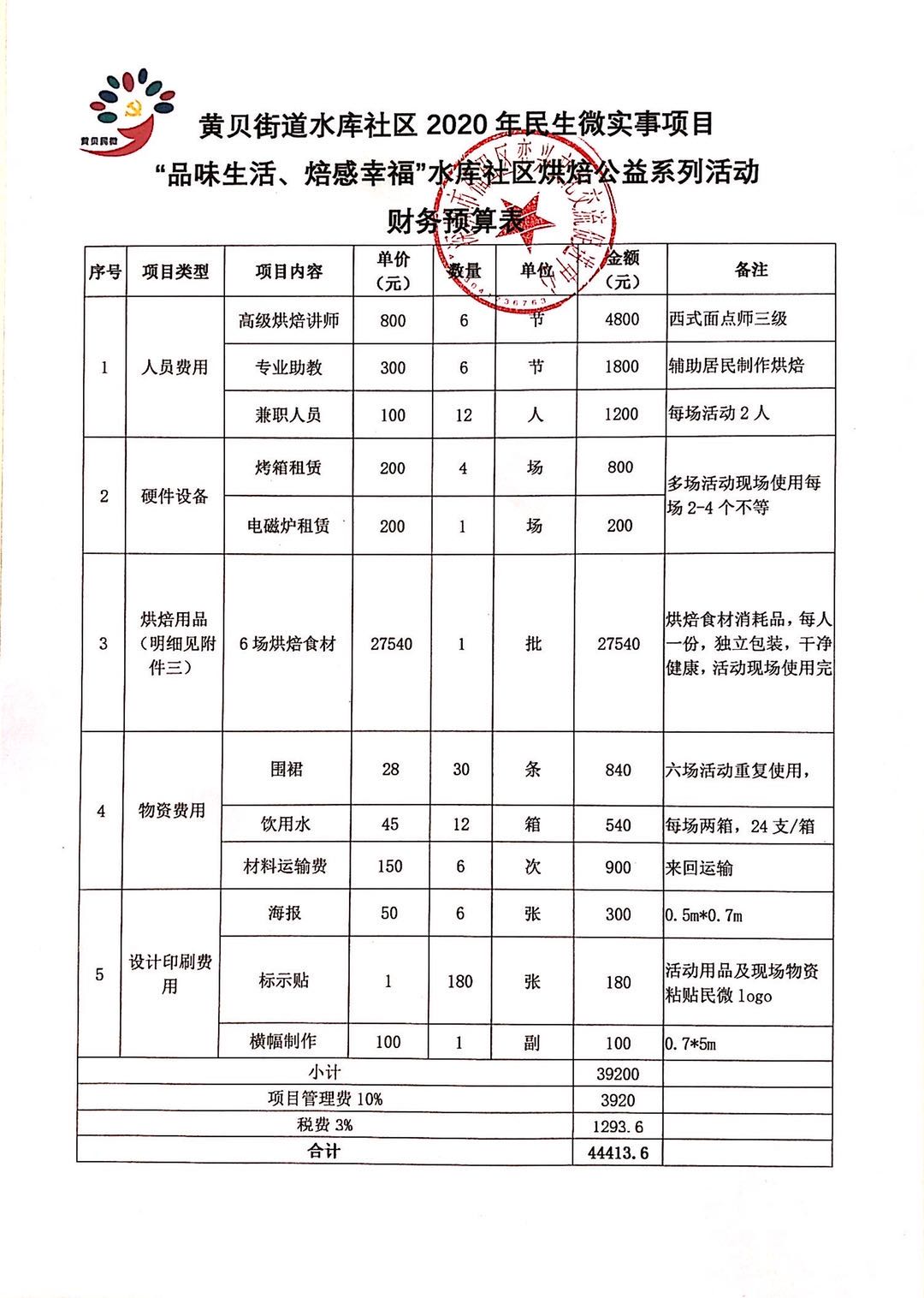 水库社区民生微实事“品味生活、焙感幸福”水库社区烘焙公益系列活动财务预算表