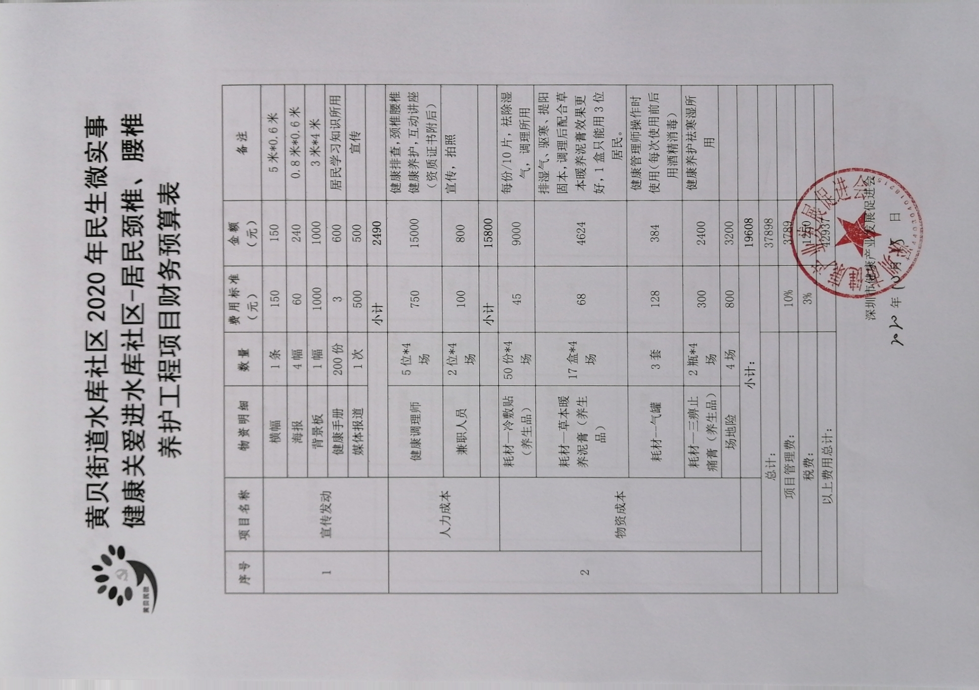 水库社区民生微实事“健康关爱进水库社区-居民颈椎、腰椎养护项目财务预算表