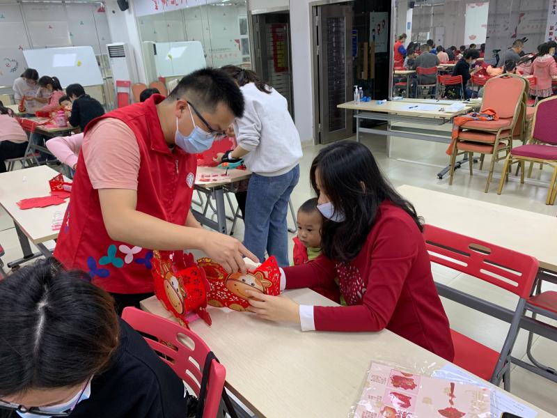 活动开始,水库社区社工带领小朋友们一起观赏春节由来动画视频以及新春简介,介绍新春的由来和斗年兽的传说,小朋友都听得津津有味,欢欣鼓舞。在接下来的环节中,社工拿出了一个牛年花灯,讲起了花灯的制作流程和注意细节,随后为每个小朋友发放了制作花灯的材料,大家动手操作,搭建框架,忙得不亦乐乎,不时传来亲子们制作的沟通声和阵阵欢声笑语。不一会儿,一盏盏可爱的牛布花灯就呈现在眼前,看着自己的动手成果,小朋友们乐在心头,喜在眉梢。最后全部亲子们还一起拍摄了一个春节的祝福视频,恭祝大家新春快乐,万事如意!