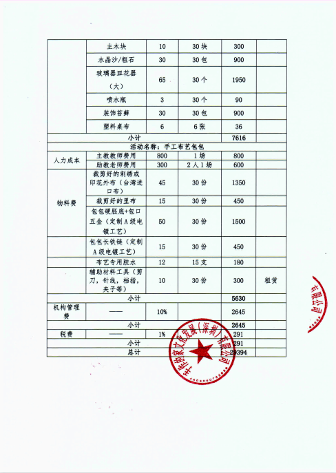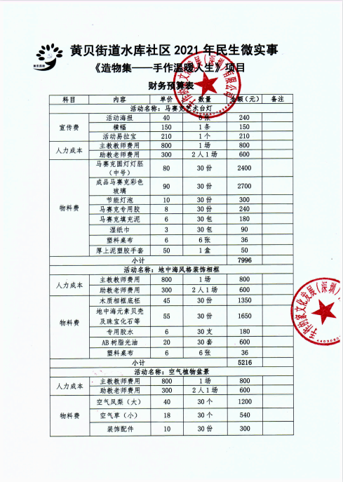 黄贝街道水库社区2021年民生微实事《造物集——手作温暖人生》项目财务预算表
