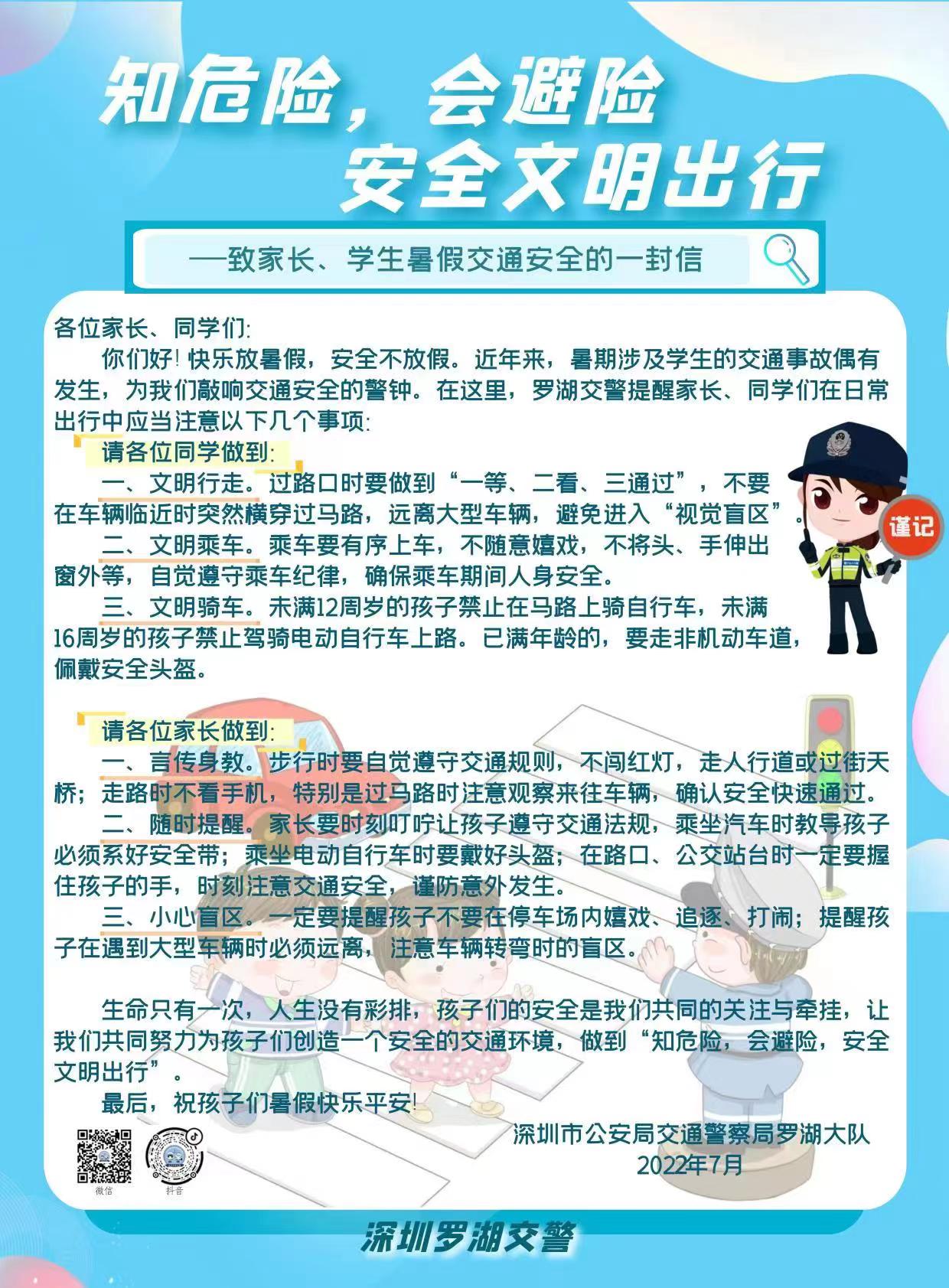 快乐放暑假,安全不放假。暑假到了,停车场也是发生事故的重点区域。请各小区转发罗湖交警大队制作的暑期学生交通安全推文、一封信。提醒学生注意假期的交通安全,尤其注意停车场的车辆盲区,切勿在地面停车场内嬉戏打闹,蹲、坐。