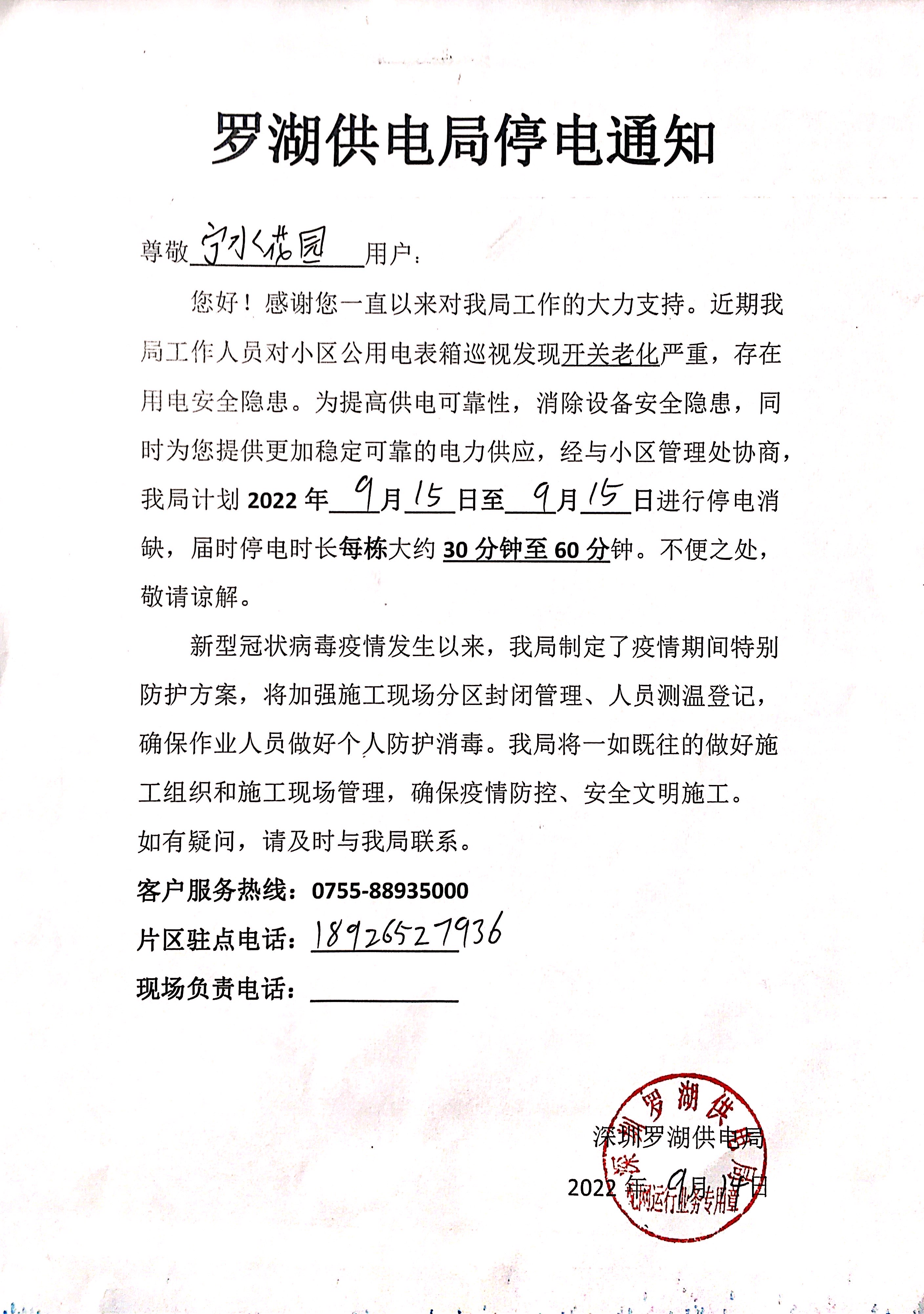 水库社区讯 尊敬的各位业主/住户:大家好!接供电局通知,从明天开始,对小区线路检修,为了不影响孩子上网课,每天中午12点到下午2点,分栋分时间段,进行停电,每次停电大约30分钟至60分钟。不变之处,敬请谅解。感谢支持!