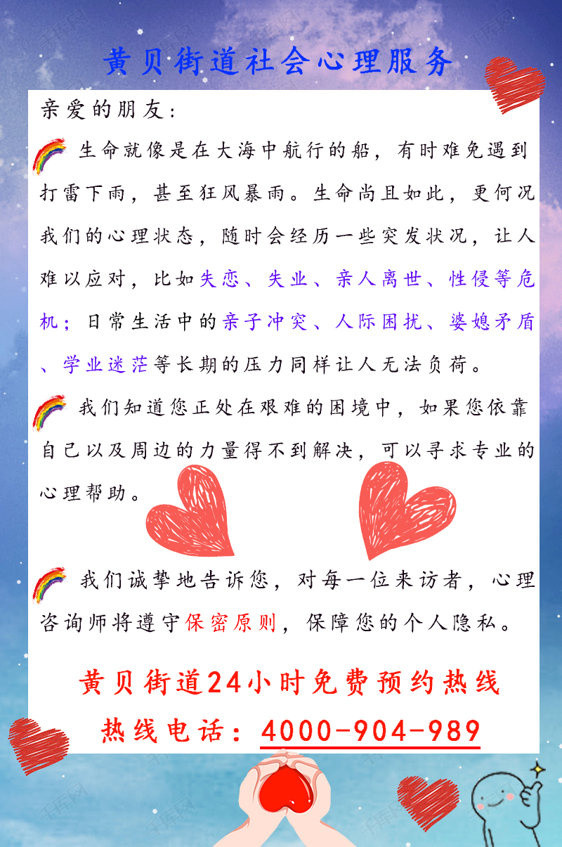 罗湖家园网讯: 亲爱的朋友们:春天如约而至,一路繁花,前路可期,“民生微实事”它来了,“黄贝街道心理服务站”提供24小时免费心理咨询服务热线“4000-904-989”,我们的心理咨询师一直都在,黄贝街道社会心理服务竭诚为您服务!