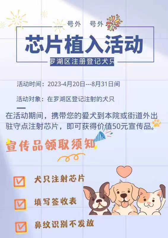 罗湖家园网讯:亲爱的各位养犬住户,宠物医院将在5月13日上午9:30–11:30在东深门口小广场开展犬只注射芯片及鼻纹识别活动,现场有宠物医院的工作人员服务,请大家带还未注射芯片的狗狗前来注射,进行芯片注射的犬主可获得价值50元的礼品。不可注射芯片的狗狗可以做鼻纹识别,欢迎大家前来咨询。