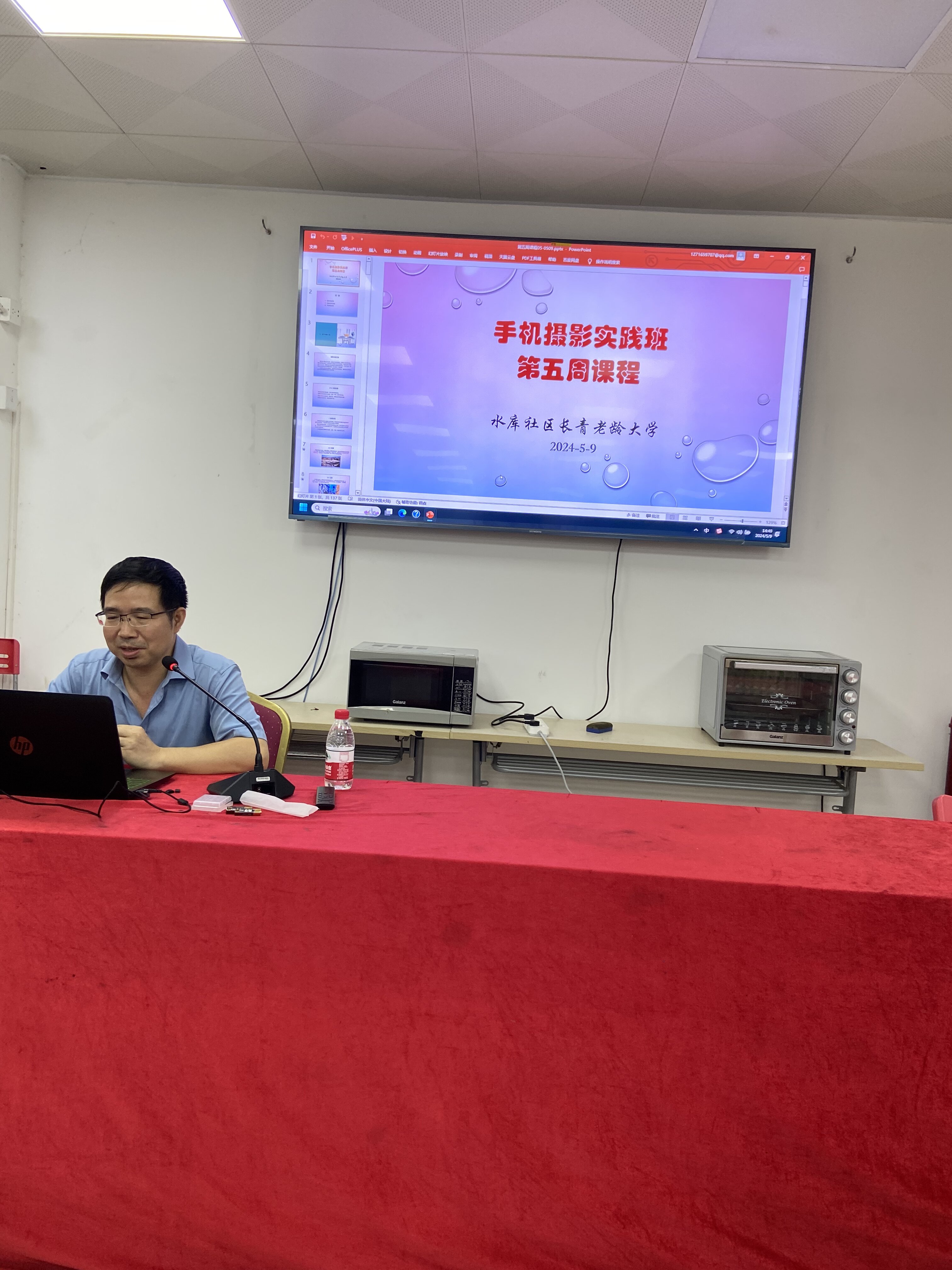 水库社区讯:2024年5月9日下午,水库社区开展长青老龄大学摄影实践班,本次为课程第五节。这节课主要讲授了远景和近景的拍摄技巧。根据讲解的要点,学员们随堂随练,当堂巩固所学知识点,学员们之前也互相帮助,营造出了和谐的课堂氛围。