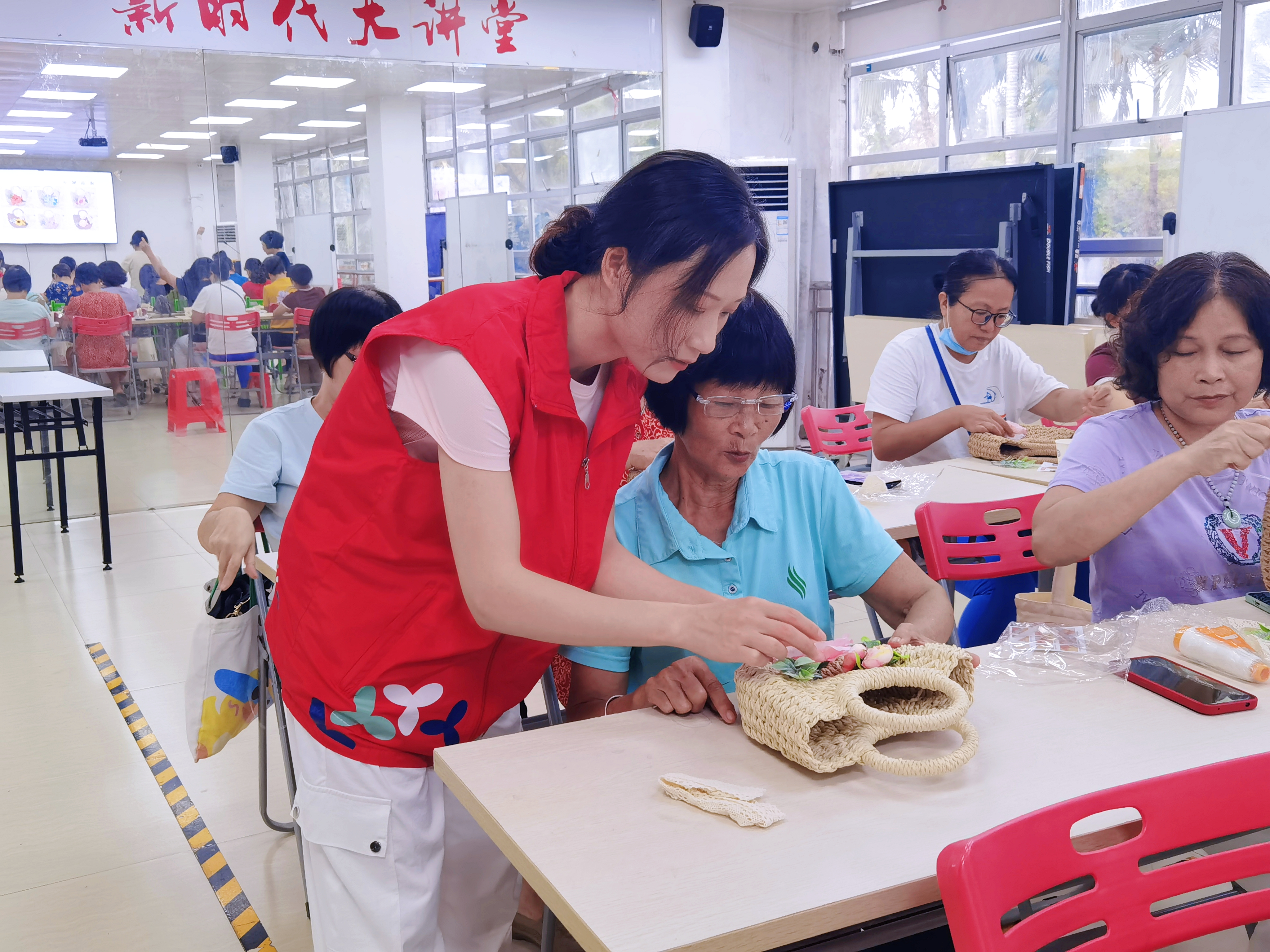 转至手工区,社工以仿真花草、彩线和草编包搭建创意工坊。依经验分组教学:新手先用粗针将单支花草固定在布片,再缝缀至包身;熟手则挑战多色渐变,用细密平针勾勒叶片纹理。“斜针绣花瓣更立体!”“针脚均匀才美观!” 讨论声此起彼伏,社工穿梭指导,随时调整走线细节,让创意在指尖绽放。