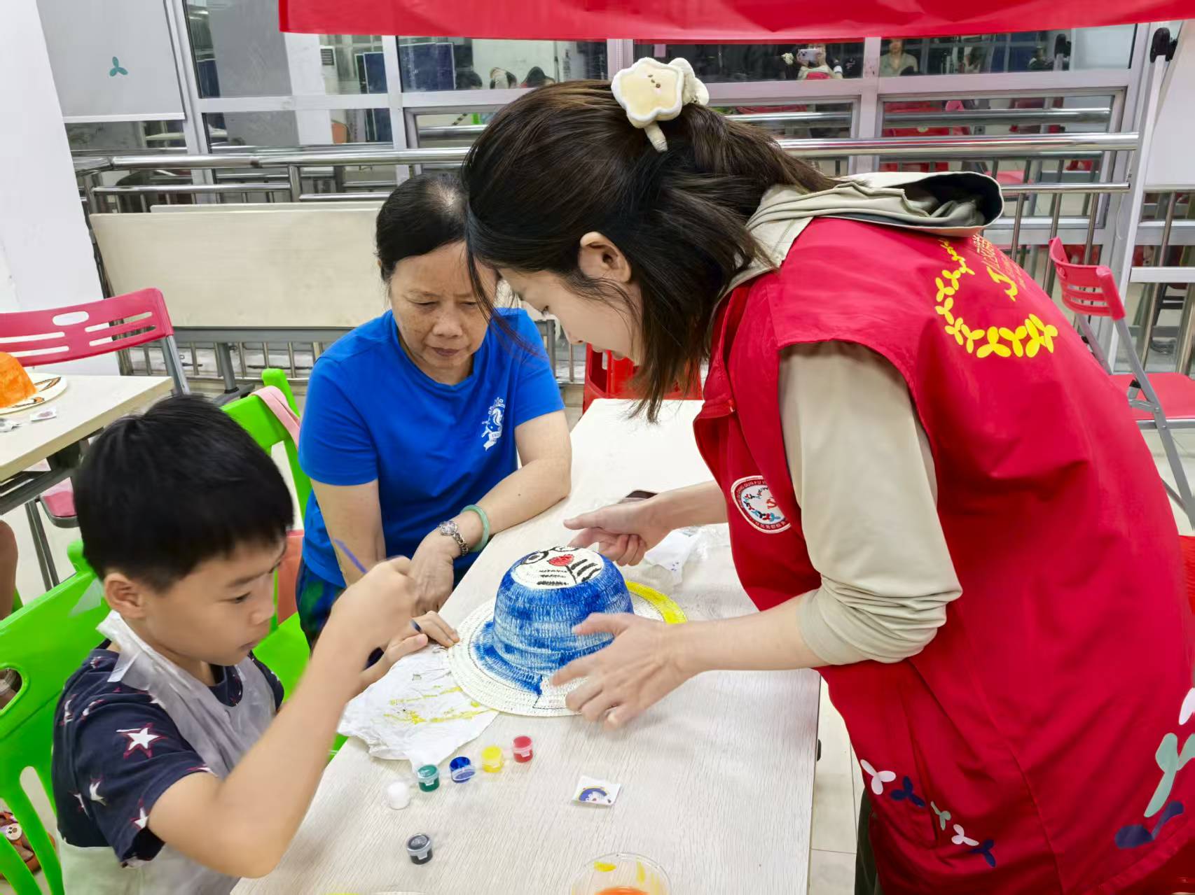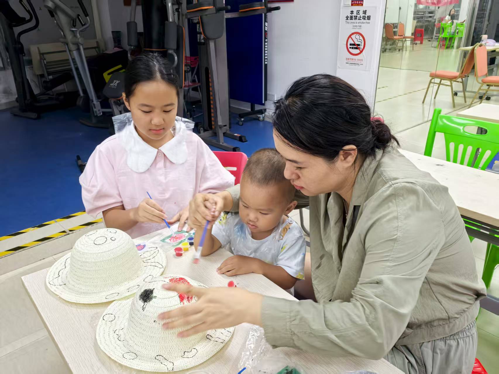 “大家可以随便发挥,想画小动物、花草,或者和爸爸妈妈一起设计个小秘密图案都可以!”社工的话音刚落,活动室里立刻响起此起彼伏的回应,画笔与草帽接触的沙沙声、孩子们兴奋的讨论声、家长们温柔的指导声交织在一起,瞬间点燃了这个夏日的活力。