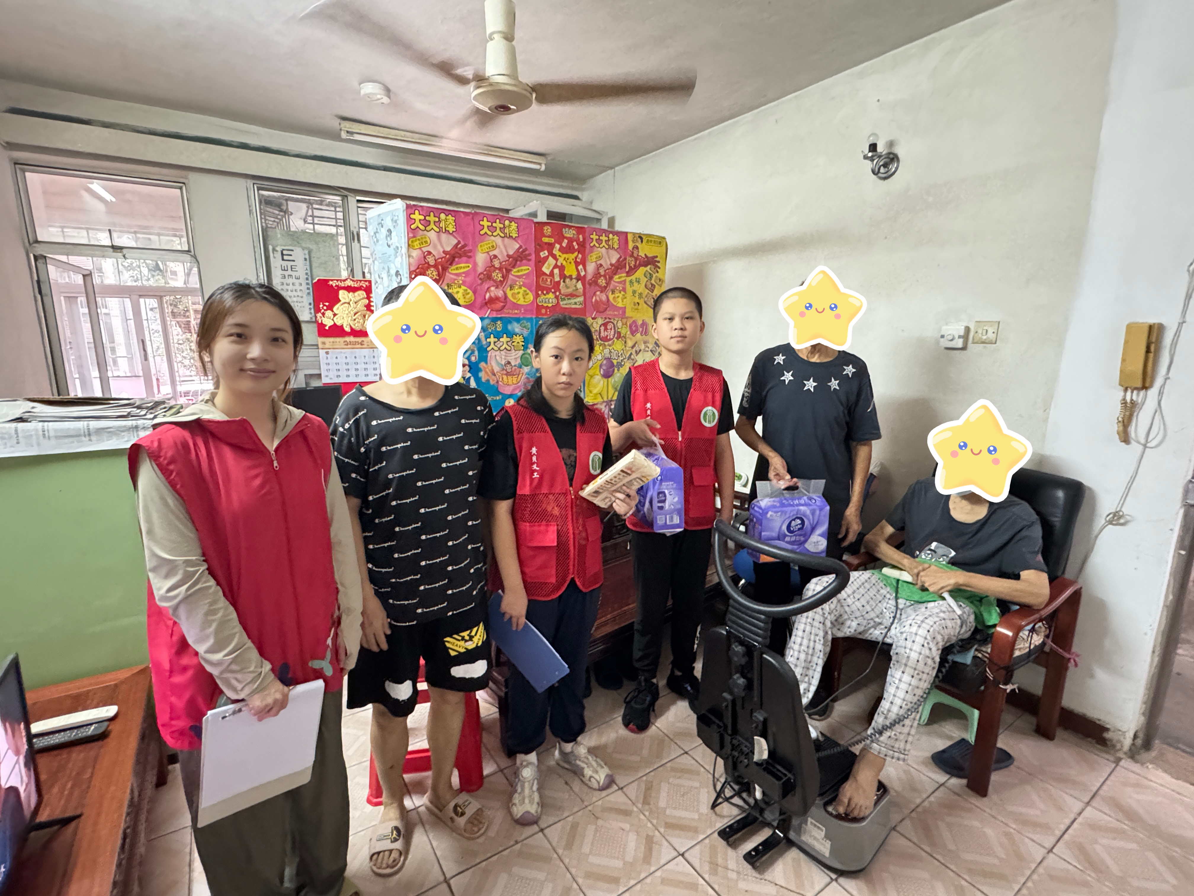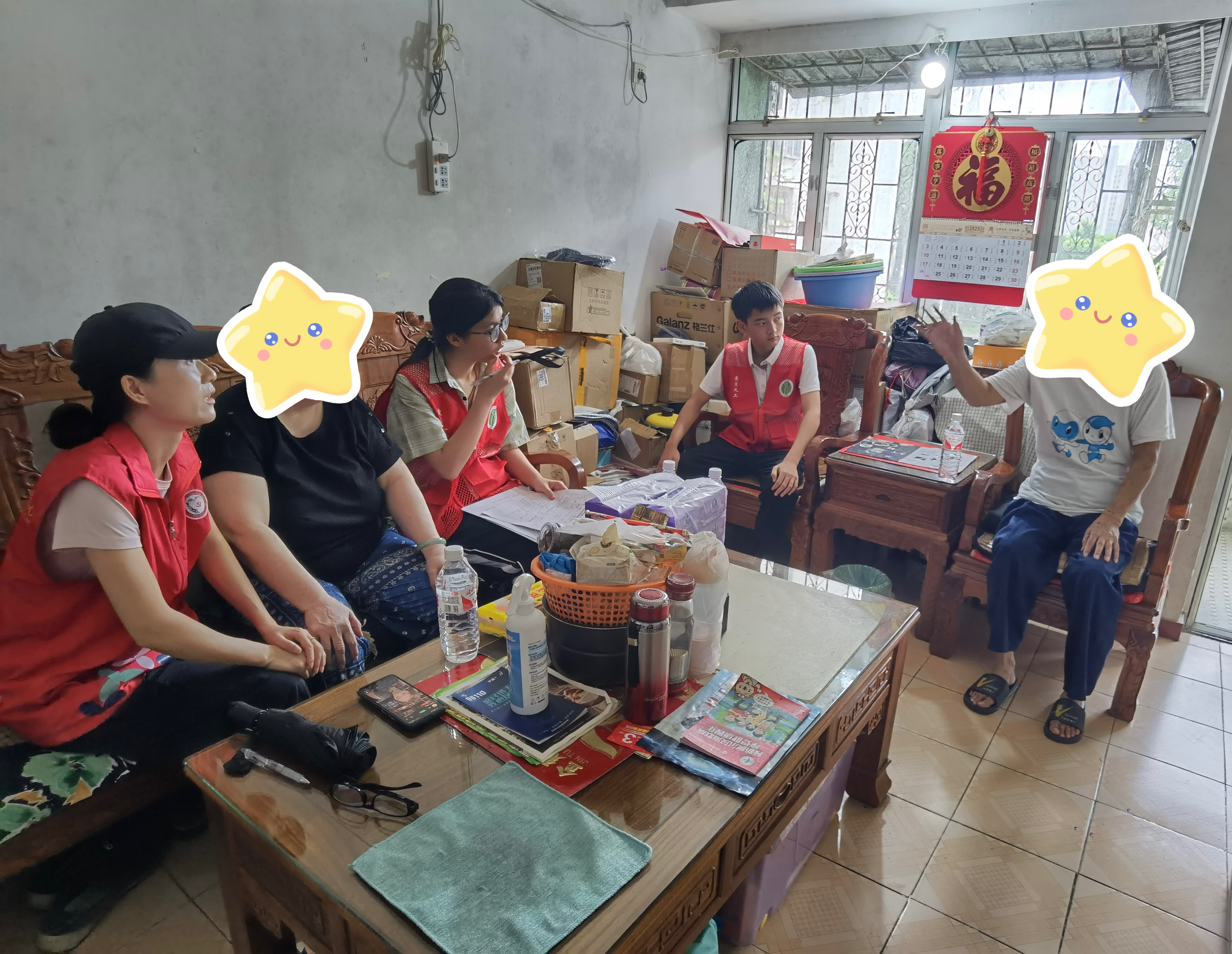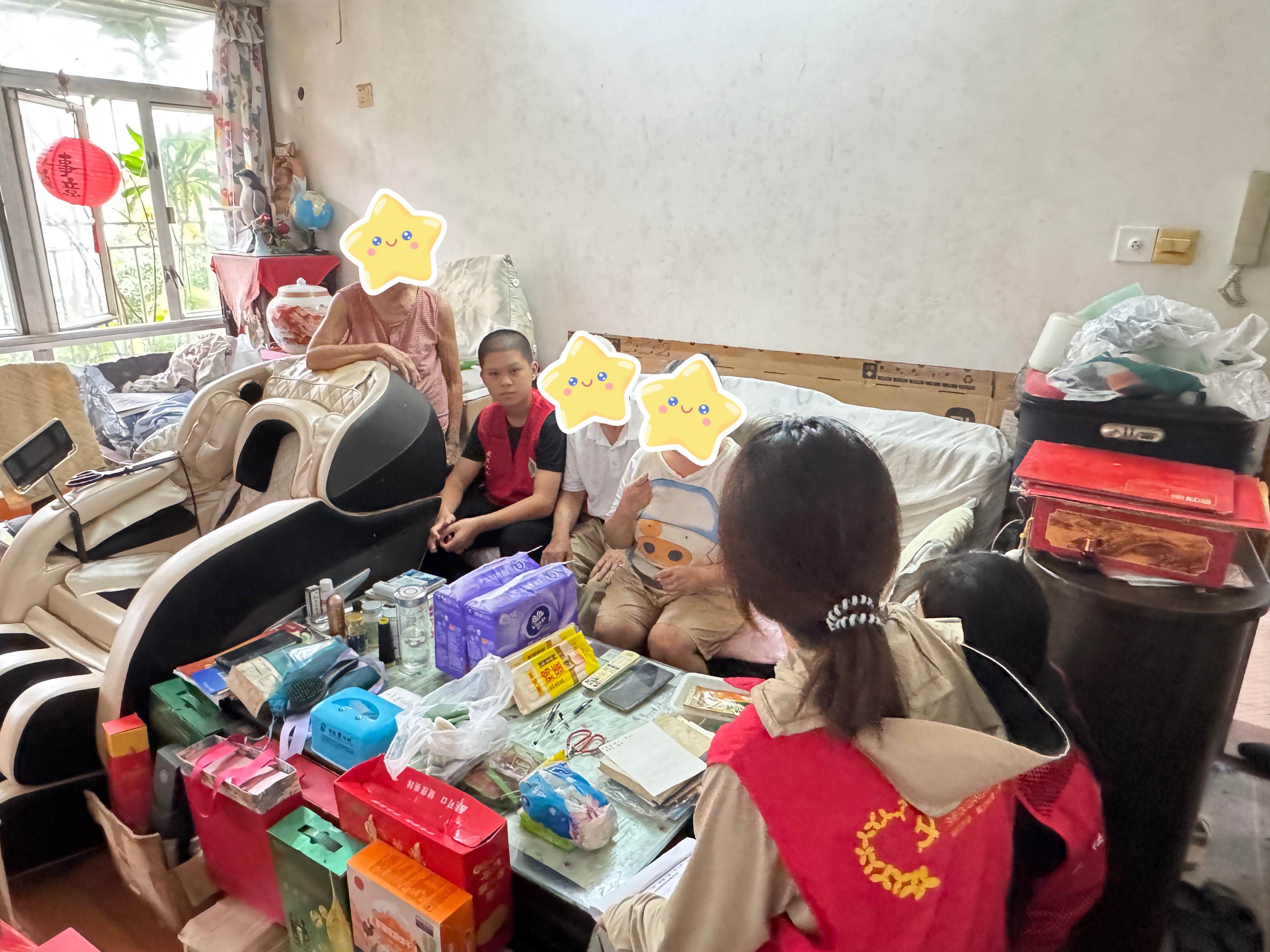 随后,青少年志愿者们在社工带领下兵分多路,提着满满爱心的慰问品走进探访对象家中。一进门,志愿者们便率先与探访对象及其家人进行了问好以及自我介绍,瞬间拉近了彼此的距离。接着,志愿者们迅速进入状态,分工明确、配合默契。有的认真仔细地观察家中卫生,简单擦拭桌椅、清扫地面,为老人们营造一个整洁、舒适的居住环境;有的围坐在探访对象身边,与他们亲切交谈,关切地询问其近期生活状况,了解基本信息、家庭情况、生活状况、困难和需求,倾听他们的故事。