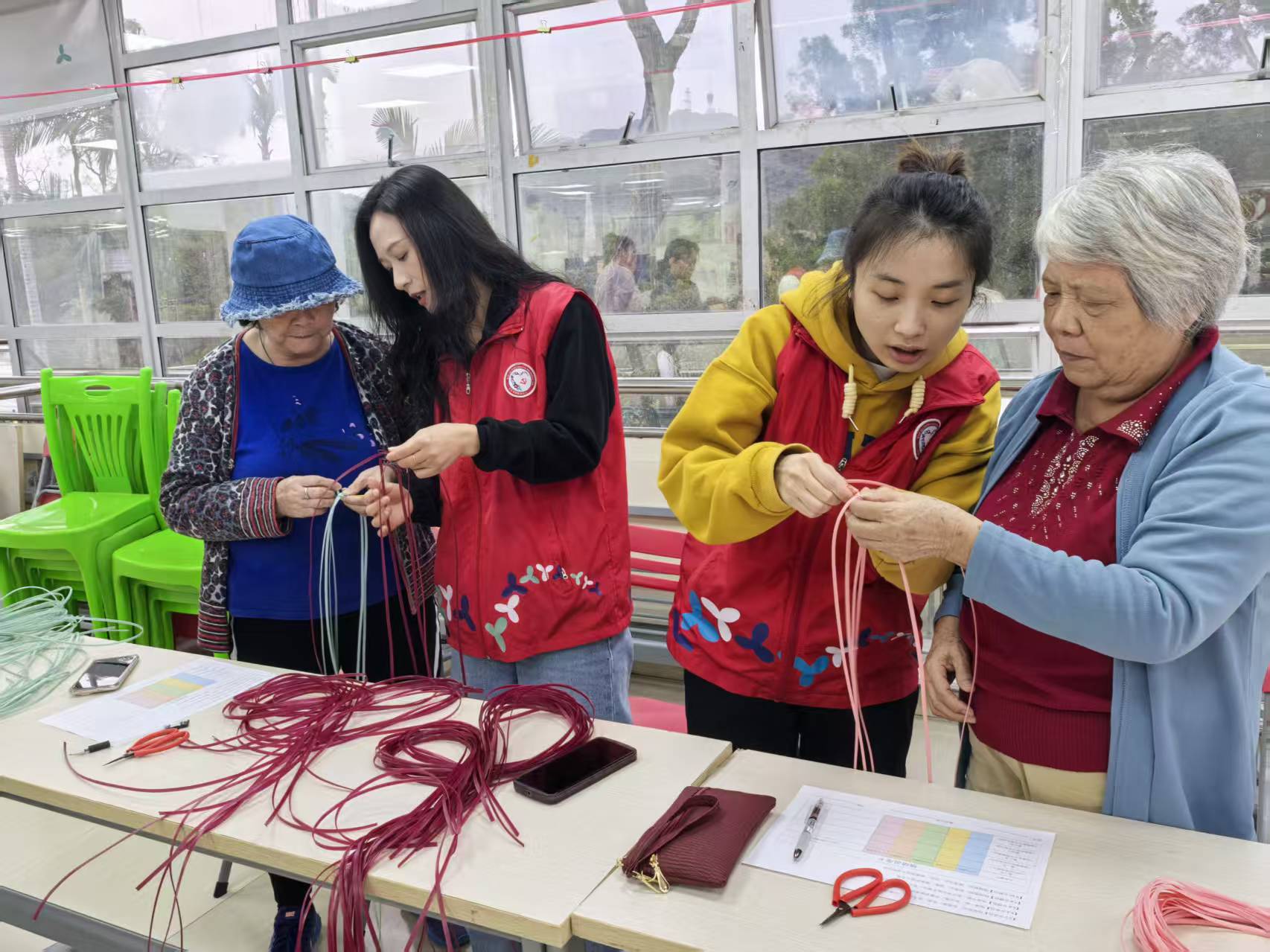 藤艺学习环节,社工以 PPT 科普藤艺文化与材料特性,从 “直线编”“十字编” 基础技法入手,结合 “小老师” 协助教学模式,通过示范指导、近身纠错助力长者掌握编织技巧。指尖翻飞间,零散藤条渐成规整纹路,活动室里满是专注探索与互助协作的温馨氛围。