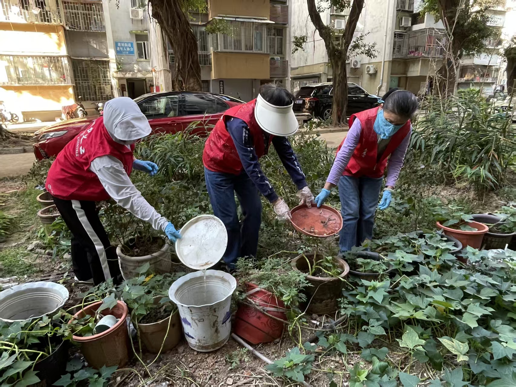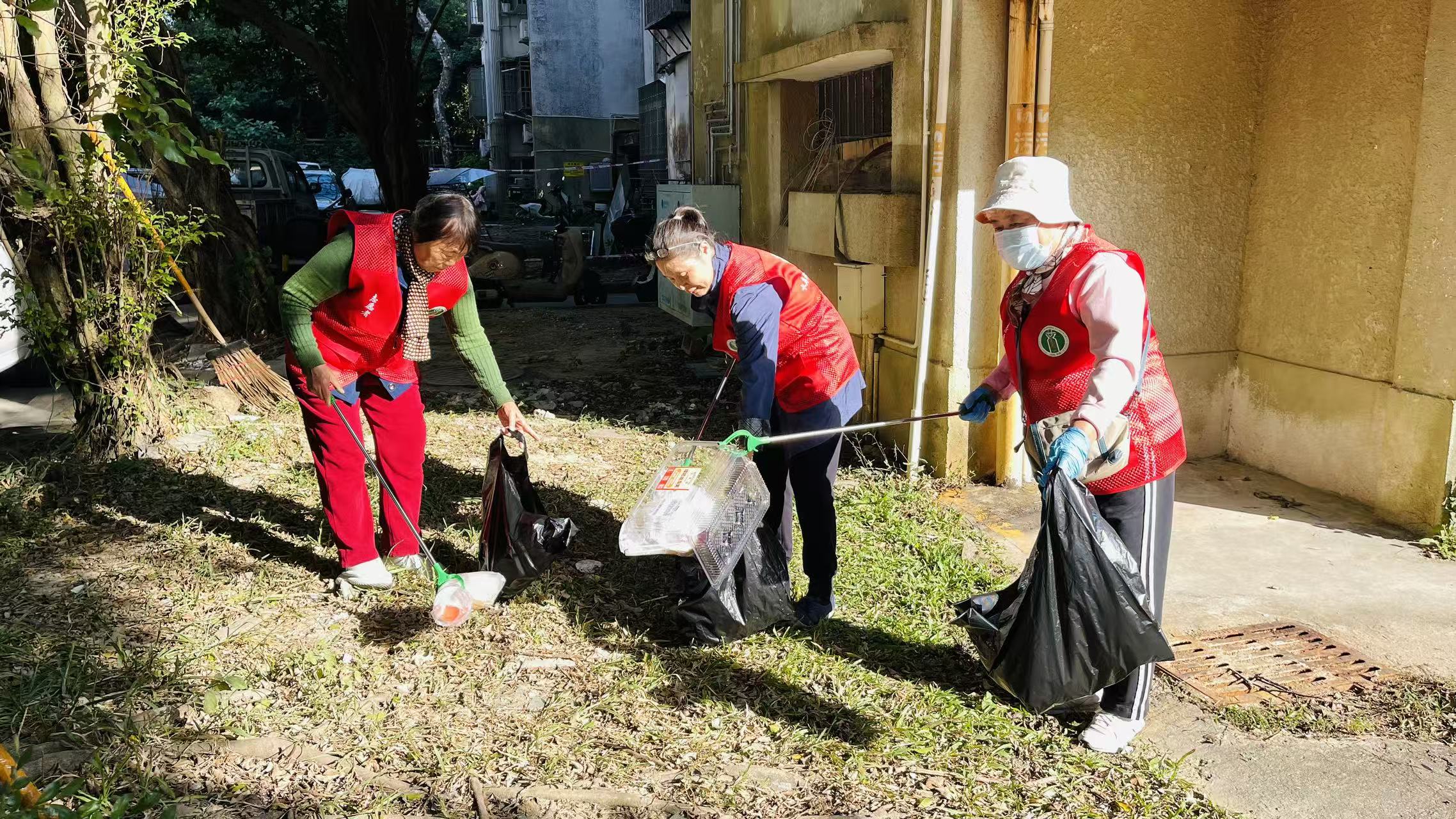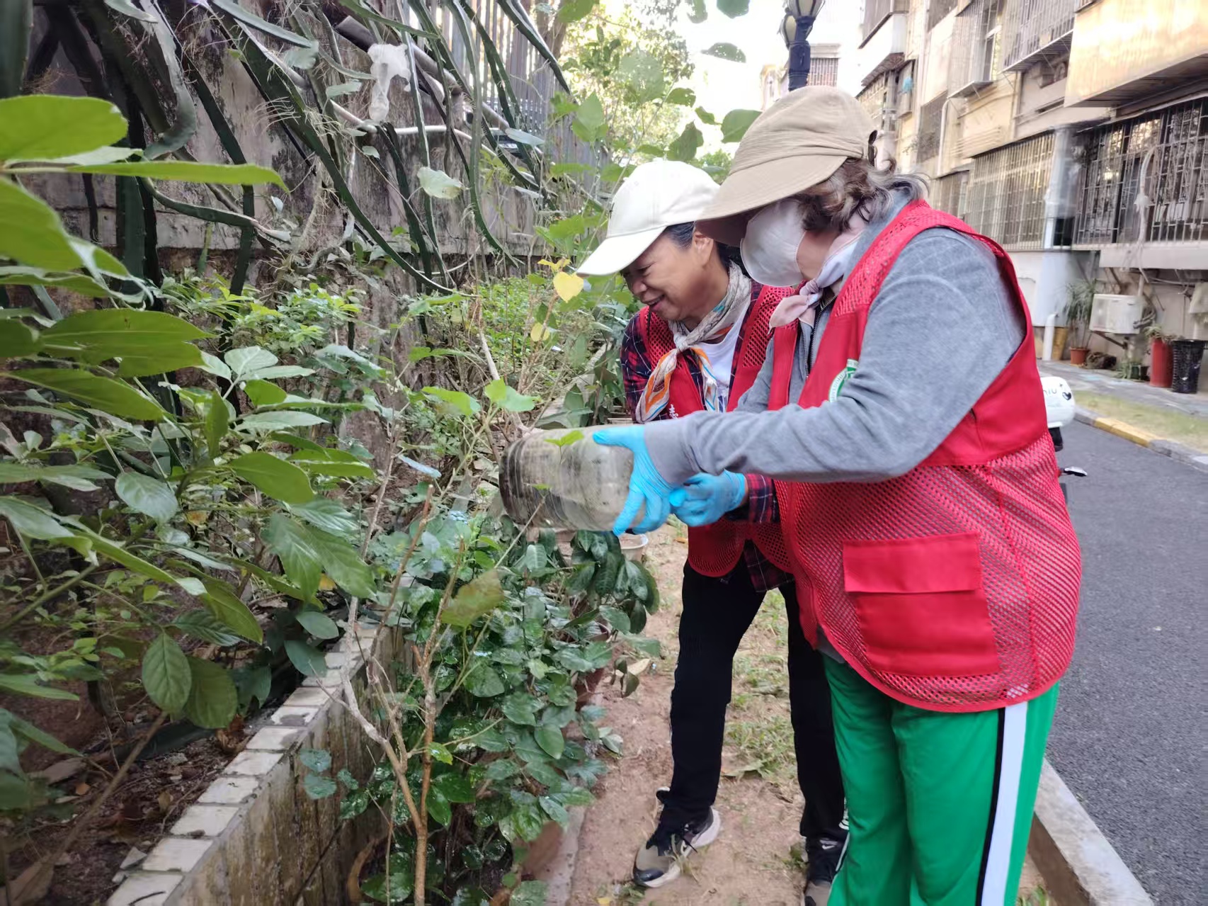 水库社区讯:2025年11月25日下午,水库社区开展聚焦垃圾清洁与基孔肯雅热防控的爱卫志愿服务活动。十几名志愿者分成“清洁队”和“防蚊队”同步行动。“清洁队”带着夹子、垃圾袋,沿着小区主干道和绿化带“地毯式”巡查,将隐藏在草丛里的零食袋、烟头,以及单元门口堆积的垃圾逐一清理;“防蚊队”则重点排查居民楼阳台、门口花池菜地,帮助居民倾倒花盆托盘、水桶里的积水,以防蚊虫滋生。