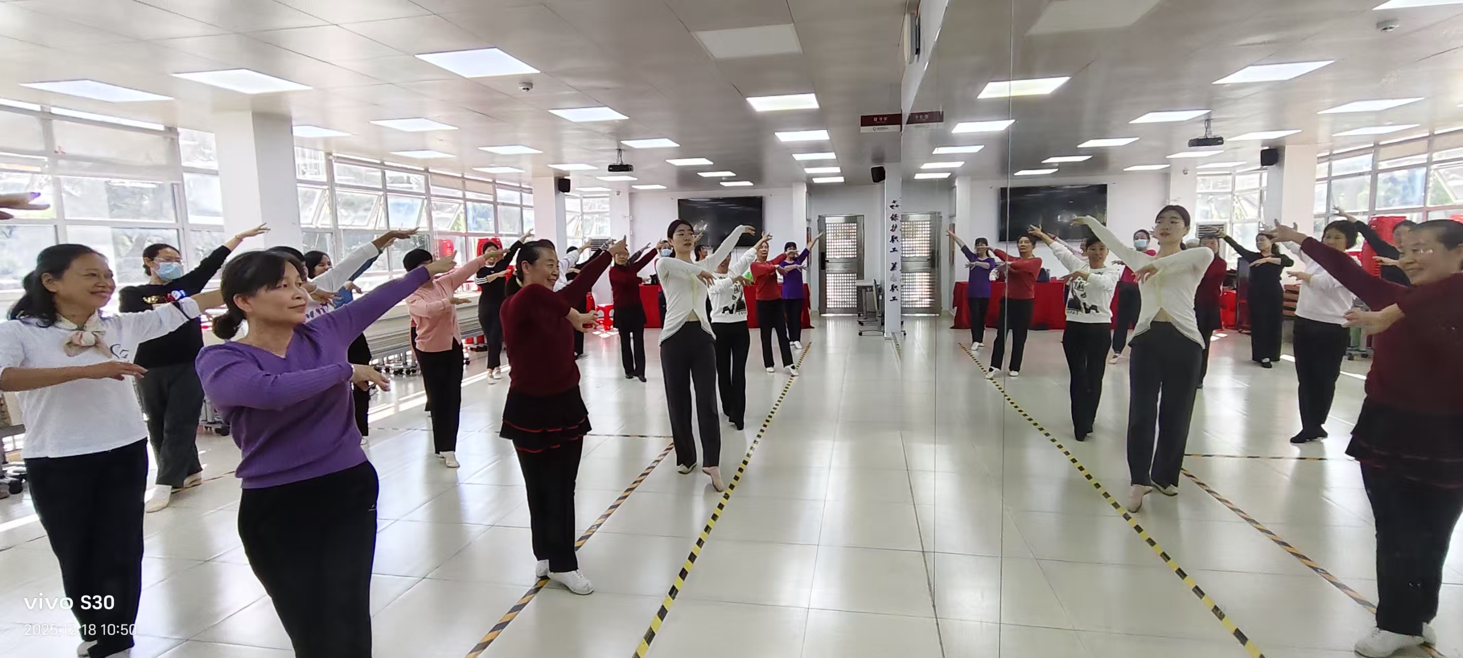 水库社区讯:2025年12月18日上午,水库社区在三楼活动室开展长青老龄大学民族舞训练班,本次为第十五节。