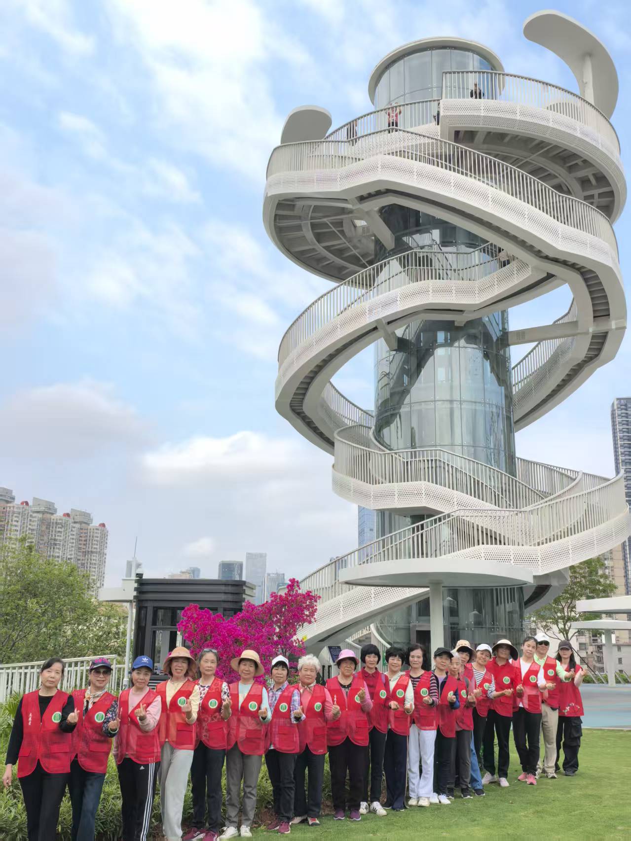 活动当天,志愿者们准时抵达集合点,有序完成签到,领取精心定制的加油包与志愿者马甲。精神饱满的队伍在社工的带领下开启徒步之旅,首站前往罗湖区新地标“湖光塔”。一行人漫步东湖公园罗湖环湖绿道,沿途草木葱郁、湖光相映,清新的自然景致让人赏心悦目。抵达湖光塔后,志愿者们登高远眺,水库全景与环湖风光尽收眼底。看着蜿蜒的绿道与波光粼粼的湖面,志愿者们纷纷驻足打卡拍照,用镜头记录美好瞬间,对社区发展的认同感与自豪感在心中油然而生,现场充满了欢乐与温暖。