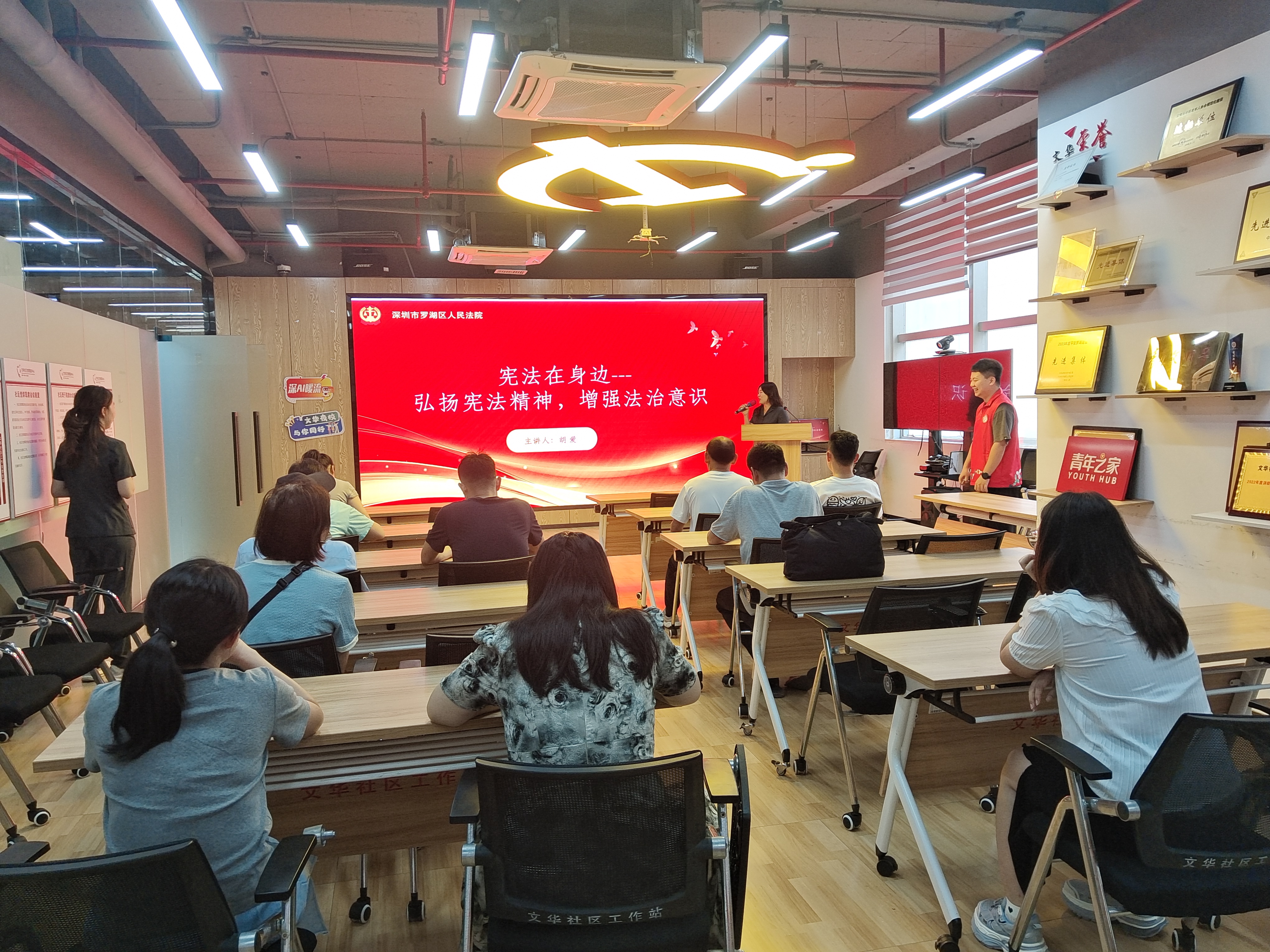 为进一步弘扬宪法精神,增强居民法治意识,营造良好的法治社区氛围,2025年7月3日下午,东西方驻文华社区党群服务中心社工团队联合深圳市罗湖区人民法院开展了一场主题为 “弘扬宪法精神,增强法治意识” 的宪法宣传讲座。此次讲座特别邀请到深圳市罗湖区人民法院综合审判庭副庭长胡爱担任主讲嘉宾,吸引了众多社区居民踊跃参与。