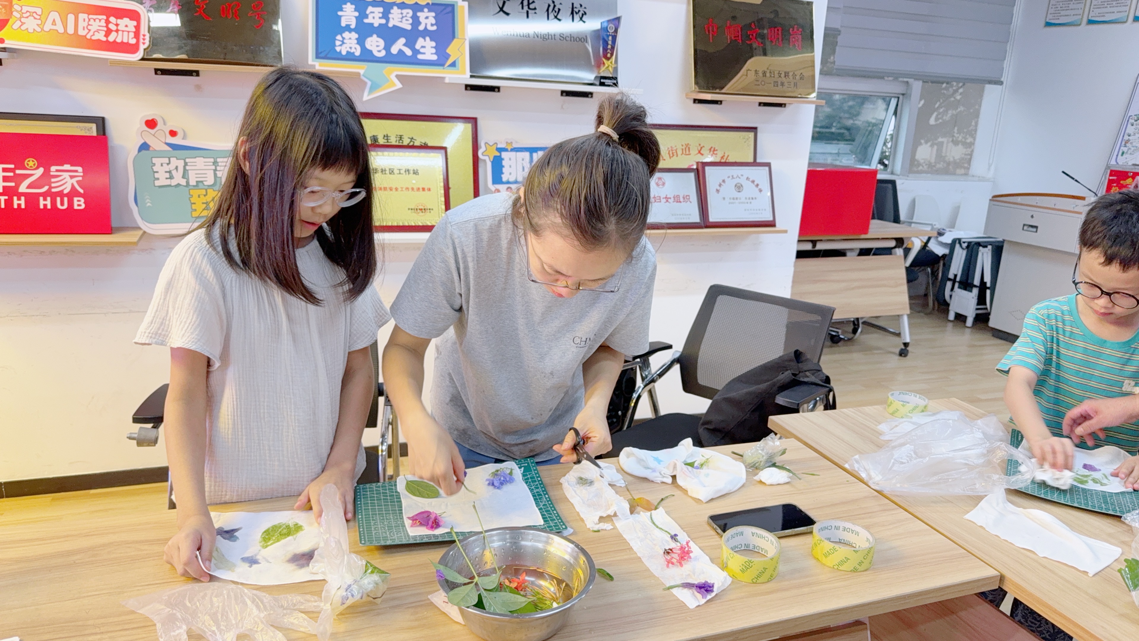 随后的植物拓印环节中,社工示范操作后,深港青少年们分组协作,将采集的植物精心摆放在手帕上。有的互相指导固定技巧,有的交流敲打力度,现场笑声不断。