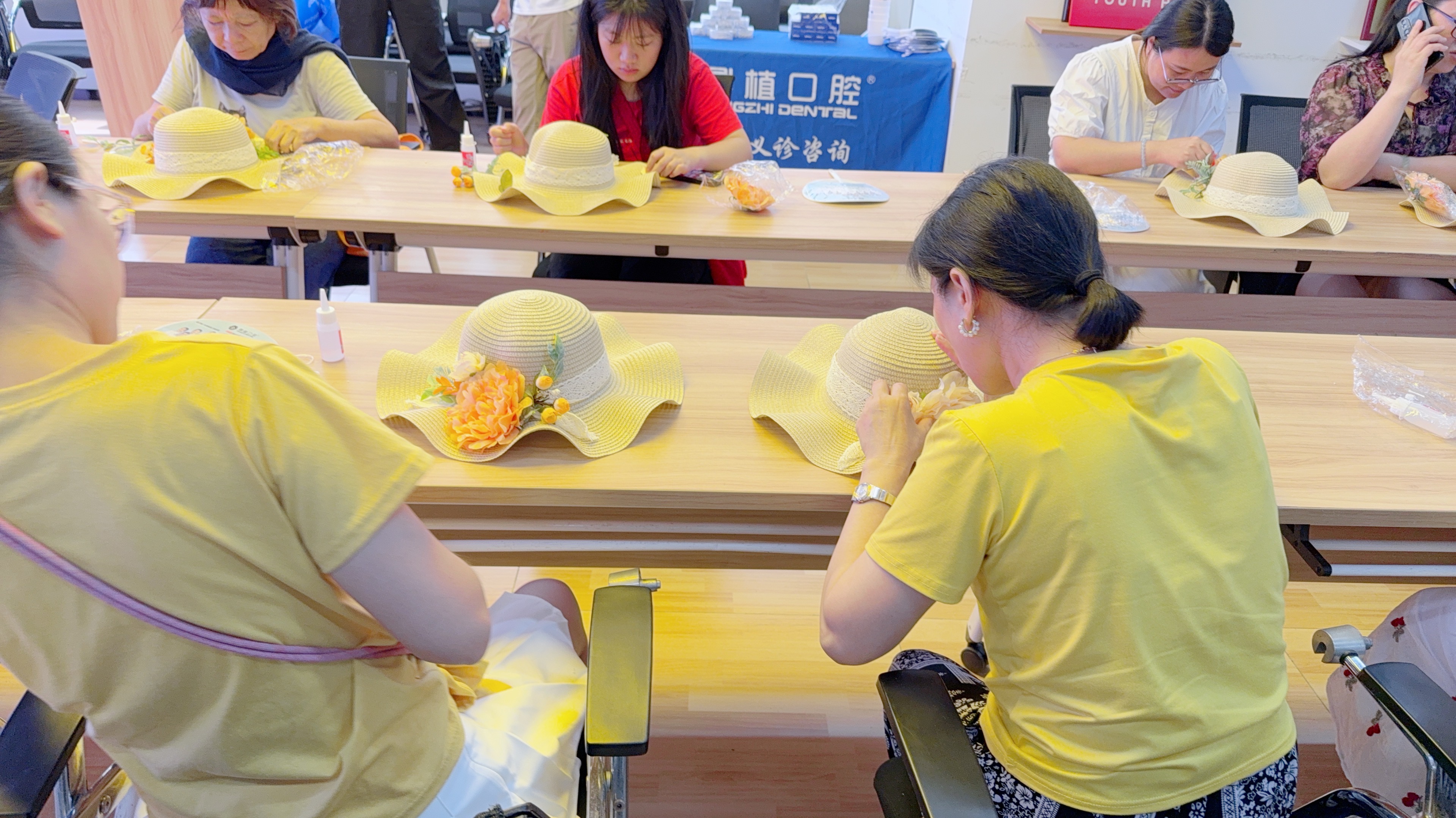 随后,活动进入轻松愉悦的草帽花艺DIY环节。在花艺老师的指导下,大家利用干花、丝带、装饰配件等材料,发挥创意,将素色草帽点缀成独一无二的时尚单品。有的成员选择清新田园风,用满天星和雏菊打造自然美感;有的则偏爱浪漫风格,以玫瑰和缎带增添优雅气息。大家一边交流花艺技巧,一边分享家庭生活中的暖心故事,在手工创作中舒缓压力,感受艺术疗愈的魅力。