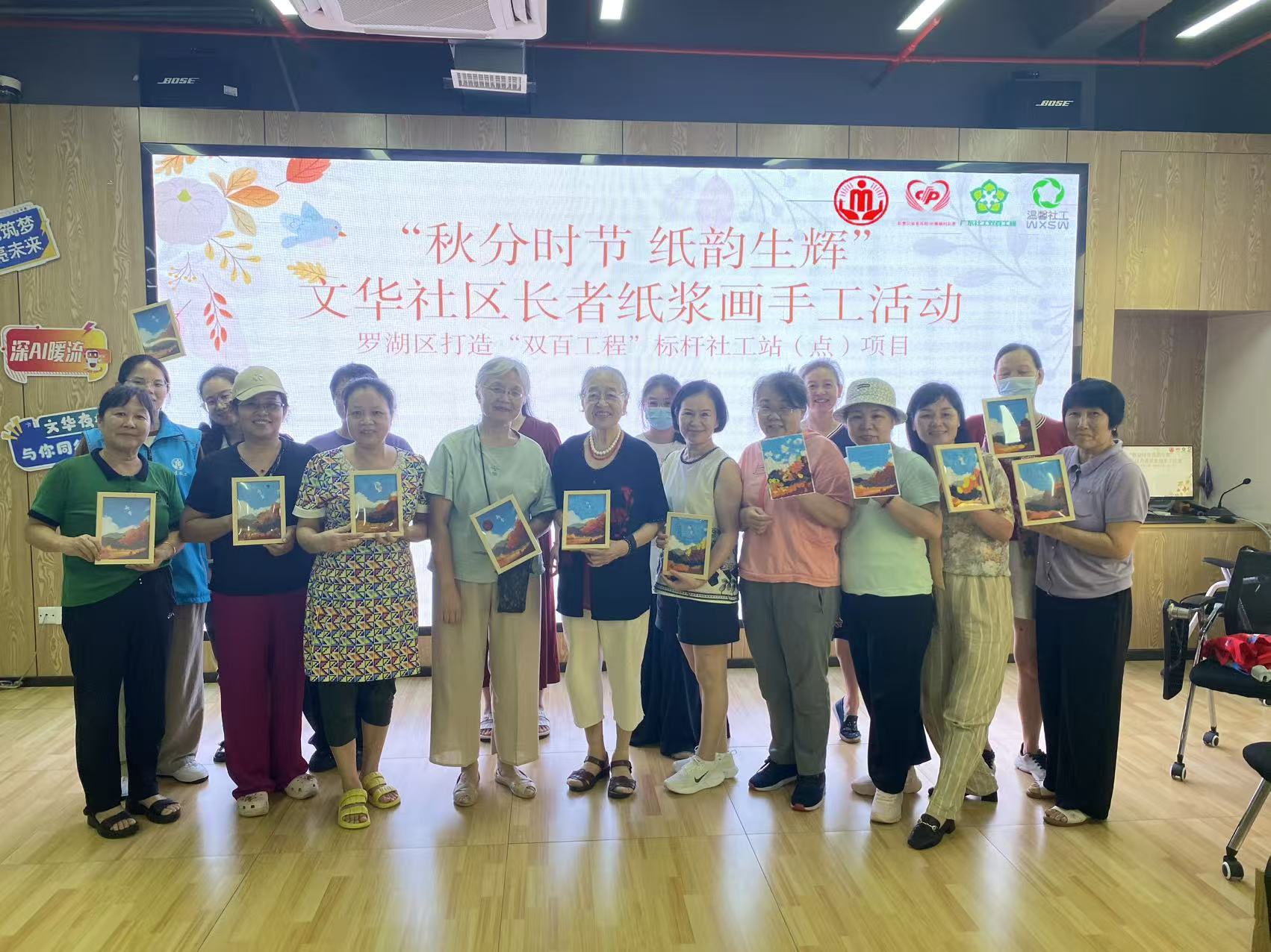 罗湖家园网讯:秋意渐浓,佳节将至。为弘扬中华优秀传统文化,丰富社区长者的精神文化生活,2025年9月28日下午,在文华社区党委的带领下,深圳温馨罗湖“双百工程”标杆社工站(点)项目驻文华社区党群服务站社工组织开展了“秋分时节·纸韵生辉”文华社区长者纸浆画手工活动。活动吸引了20位文华社区长者积极参与,大家在轻松愉快的氛围中共同感受节气文化与手工艺术的融合魅力。