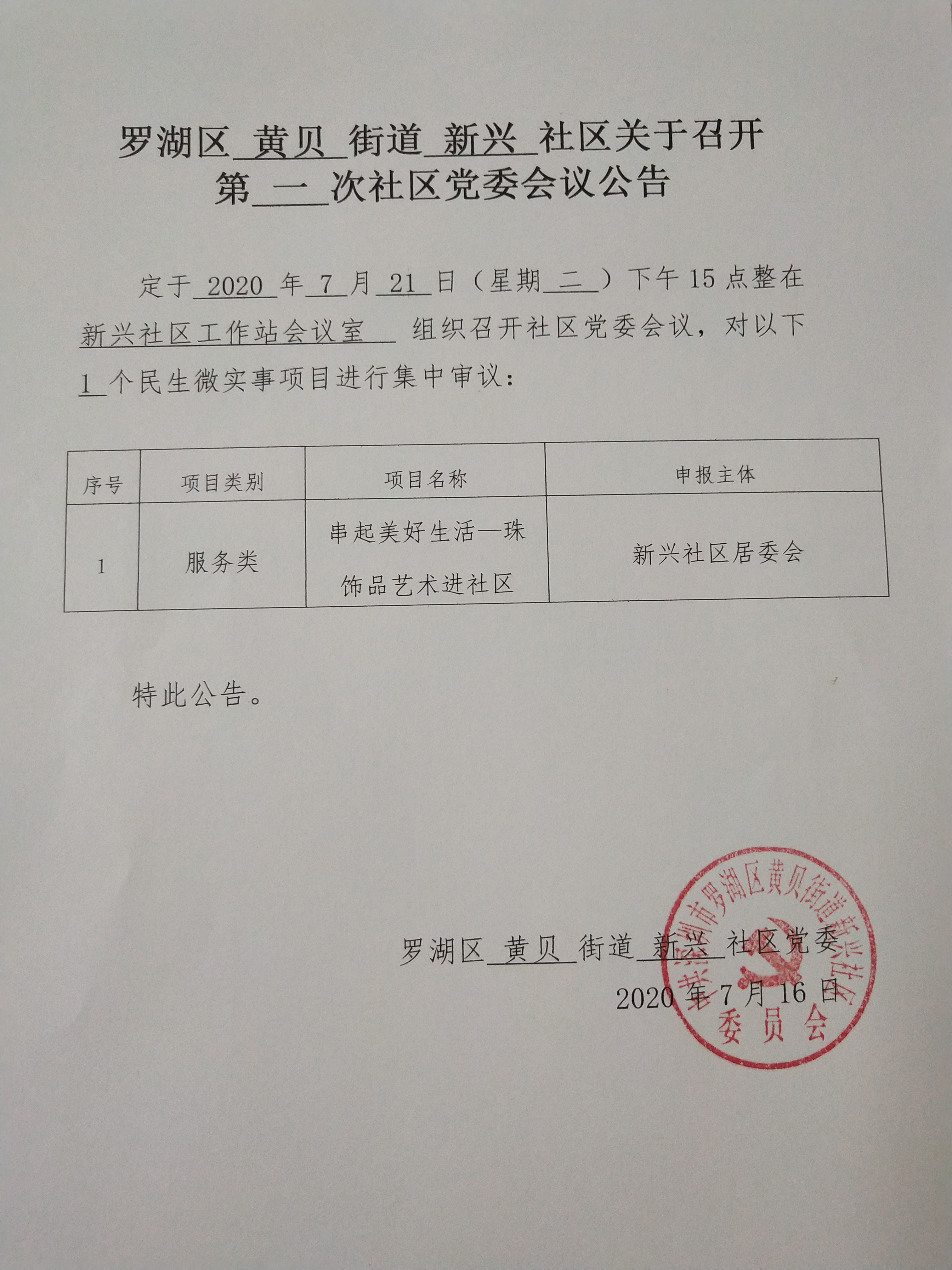 罗湖区黄贝街道新兴社区关于召开第一次社区党委会议公告