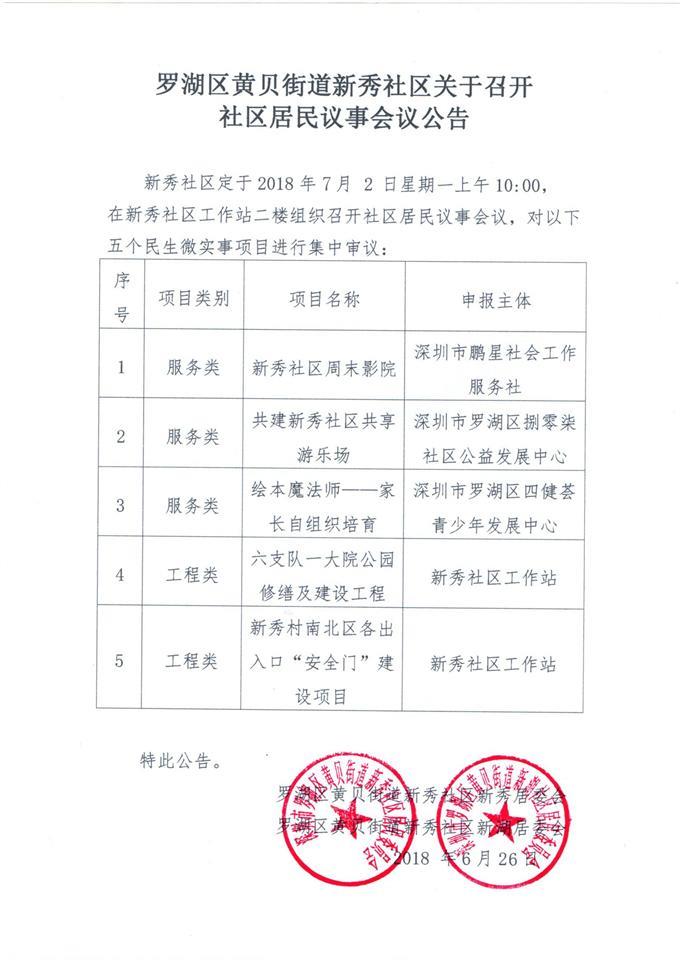 新秀社区2018年7月关于召开社区居民议事会议公告