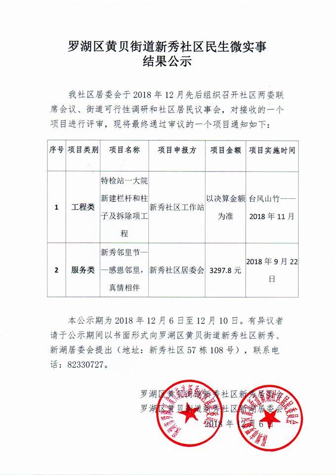 新秀社区2018年12月关于召开社区居民议事会结果公示