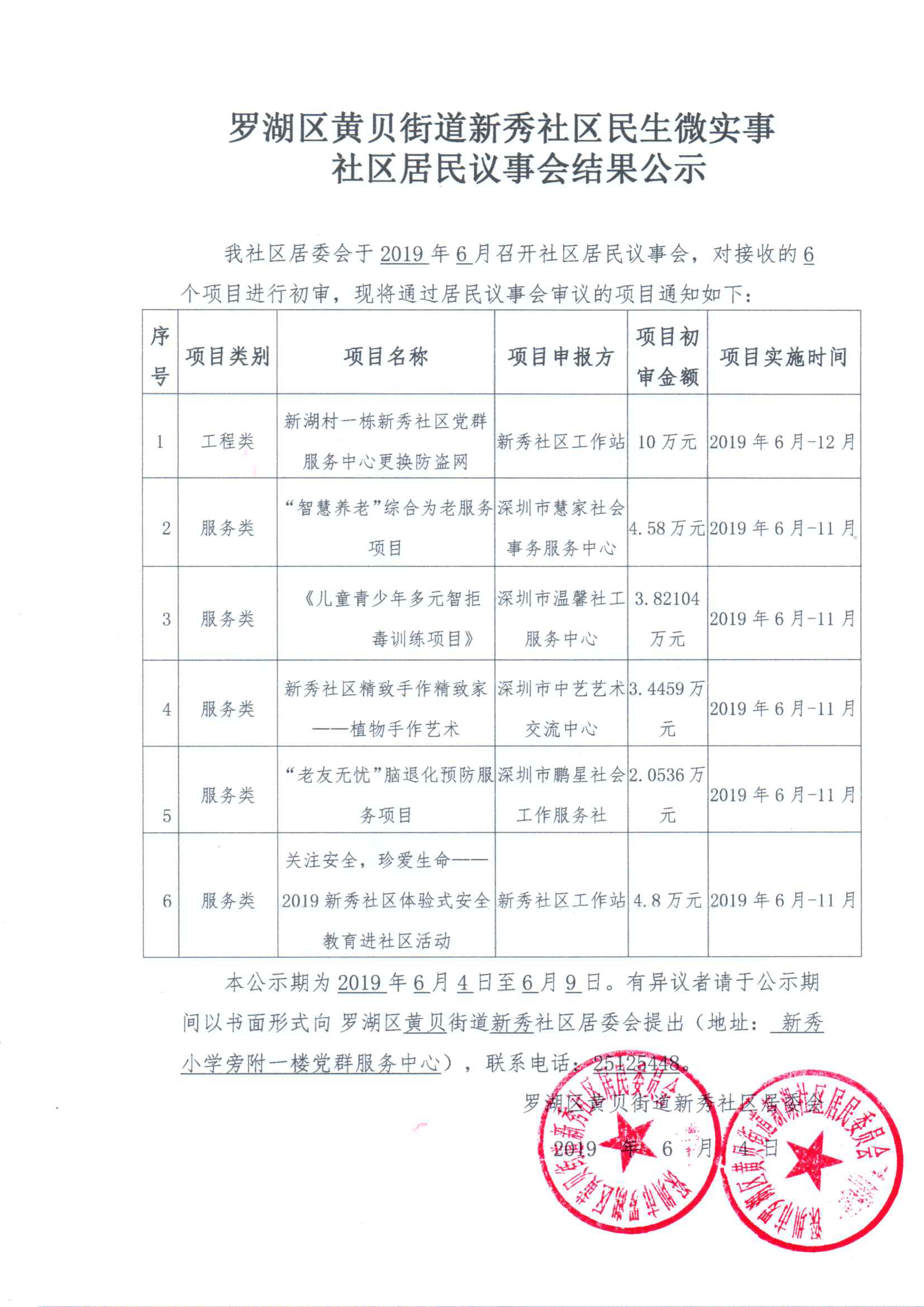 新秀社区2019年6月关于召开社区居民议事会结果公示