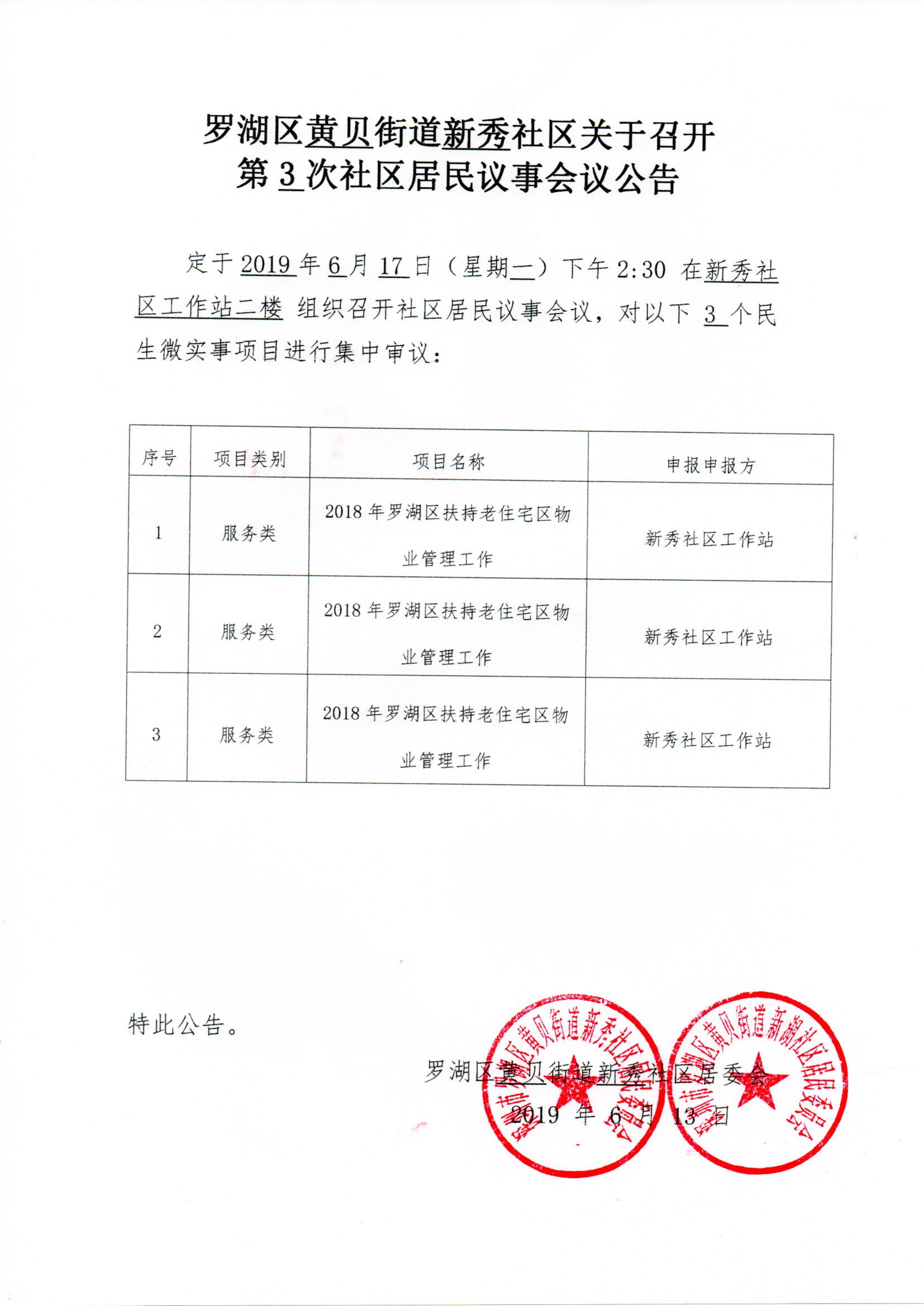 新秀社区2019年6月第二次关于召开社区居民议事会公告