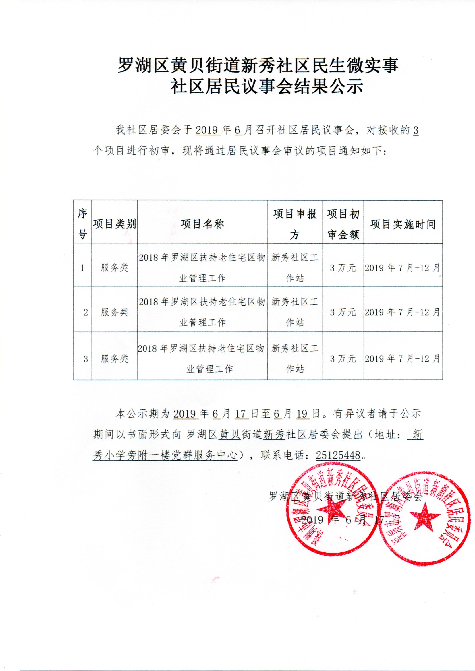新秀社区2019年6月关于召开社区居民议事会结果公示