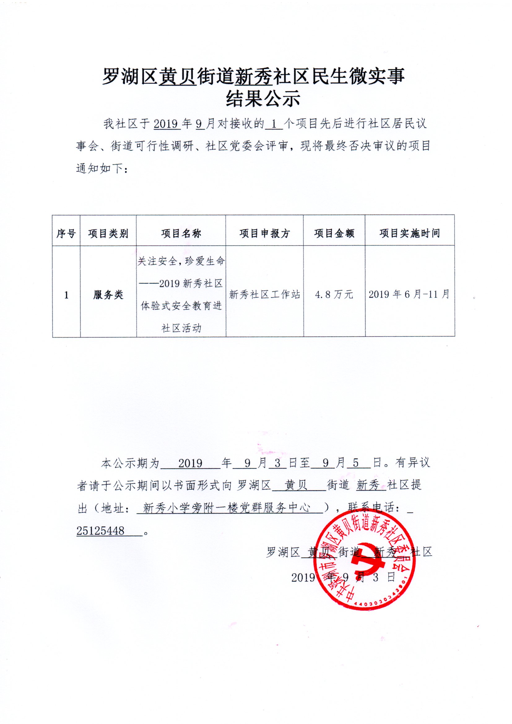 黄贝街道关于2019年民生微实事《关注安全,珍爱生命——2019新秀社区体验式安全教育进社区活动》项目取消结果公示