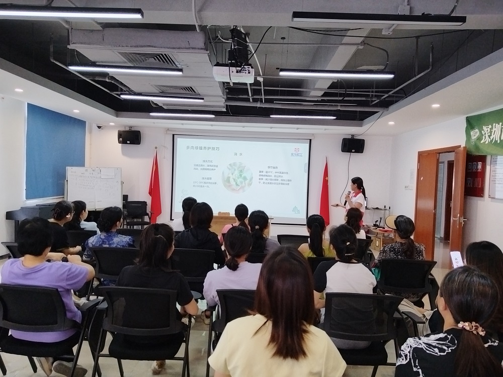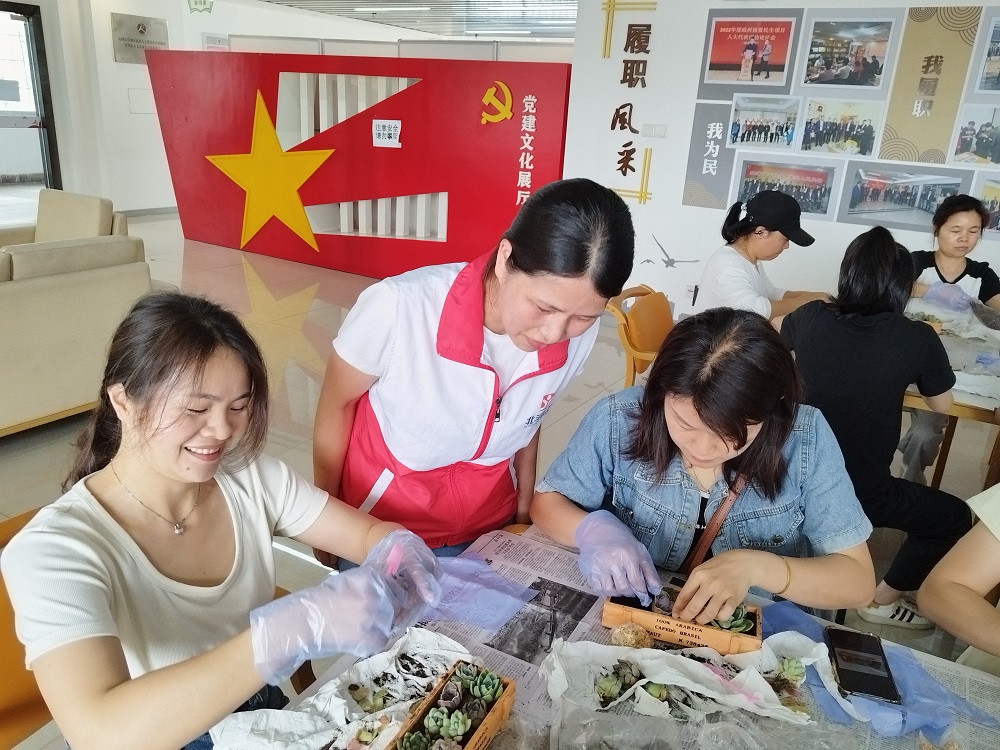 活动来到主要环节——巧手生花,绽放芳华:多肉盆栽种植。社工首先向参与者们讲解多肉的特点以及种植方法和养护技巧,接着向大家分发多肉种植材料和工具,在社工的指导下,大家一步步学习种植多肉盆栽。活动过程中,大家互相交流、分享心得,现场气氛热烈。经过一个小时的制作,一盆盆精美的多肉盆栽诞生了。“这个节日过得很有仪式感,感谢社区为我们准备一场既有心又温馨的母亲节活动。”居民詹女士拿着自己的作品高兴地说。