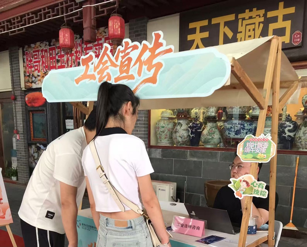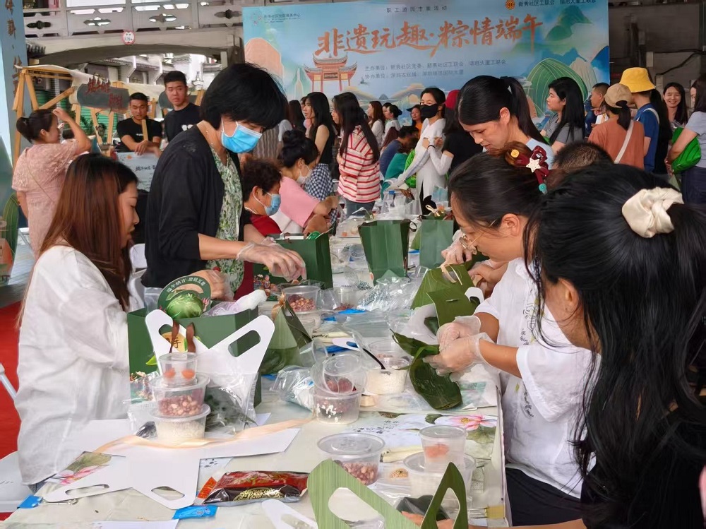 艾叶飘香,端午情浓。在端午节及“文化和自然遗产日”来临之际,5月28日下午,新秀社区党委、新秀社区工联会和瑞思大厦工联会在古玩城文化舞台联合开展“ 非遗玩趣·粽情端午”职工游园市集活动,吸引辖区超200名职工热情参与,共同感受浓厚的节日氛围。