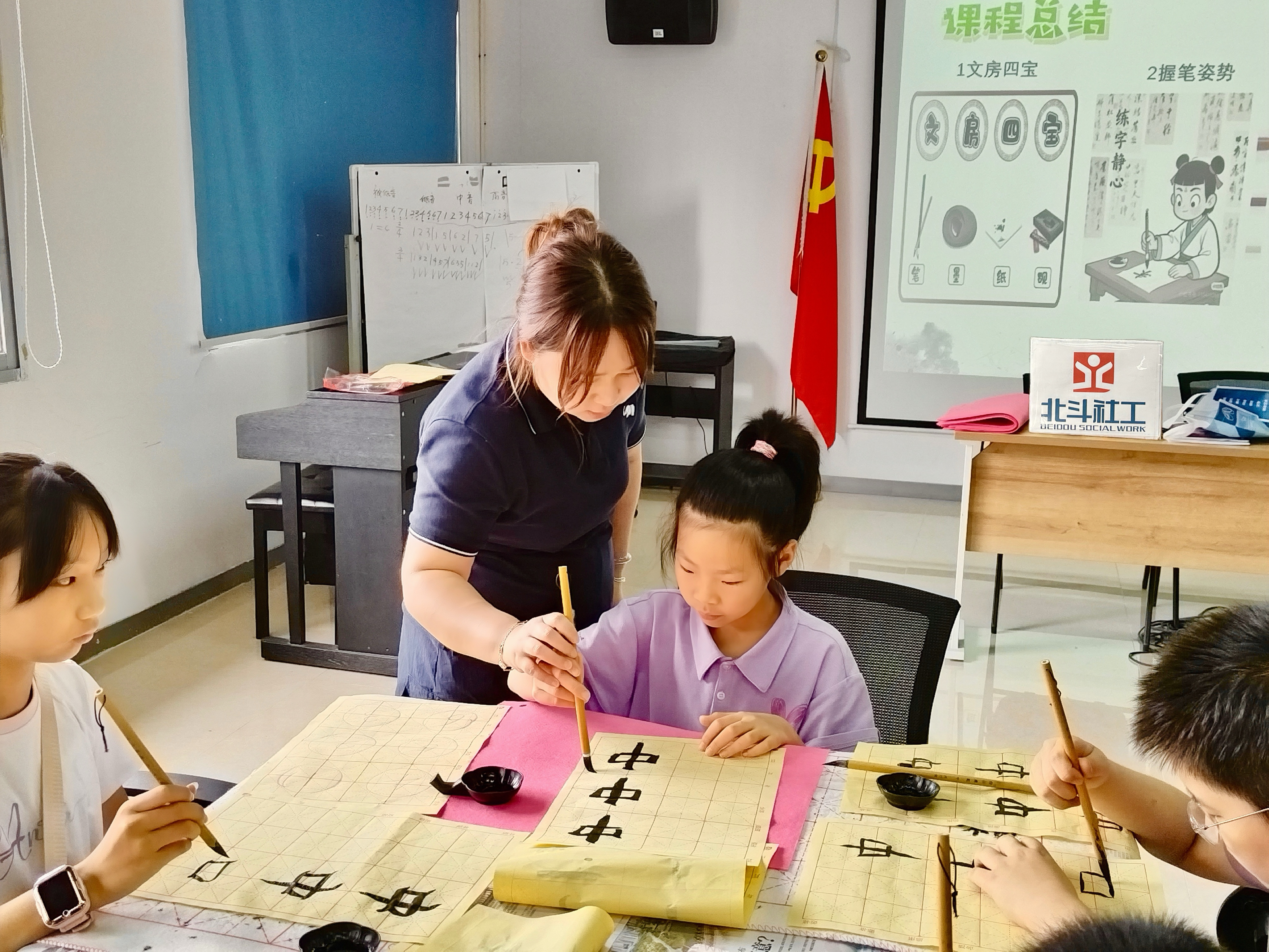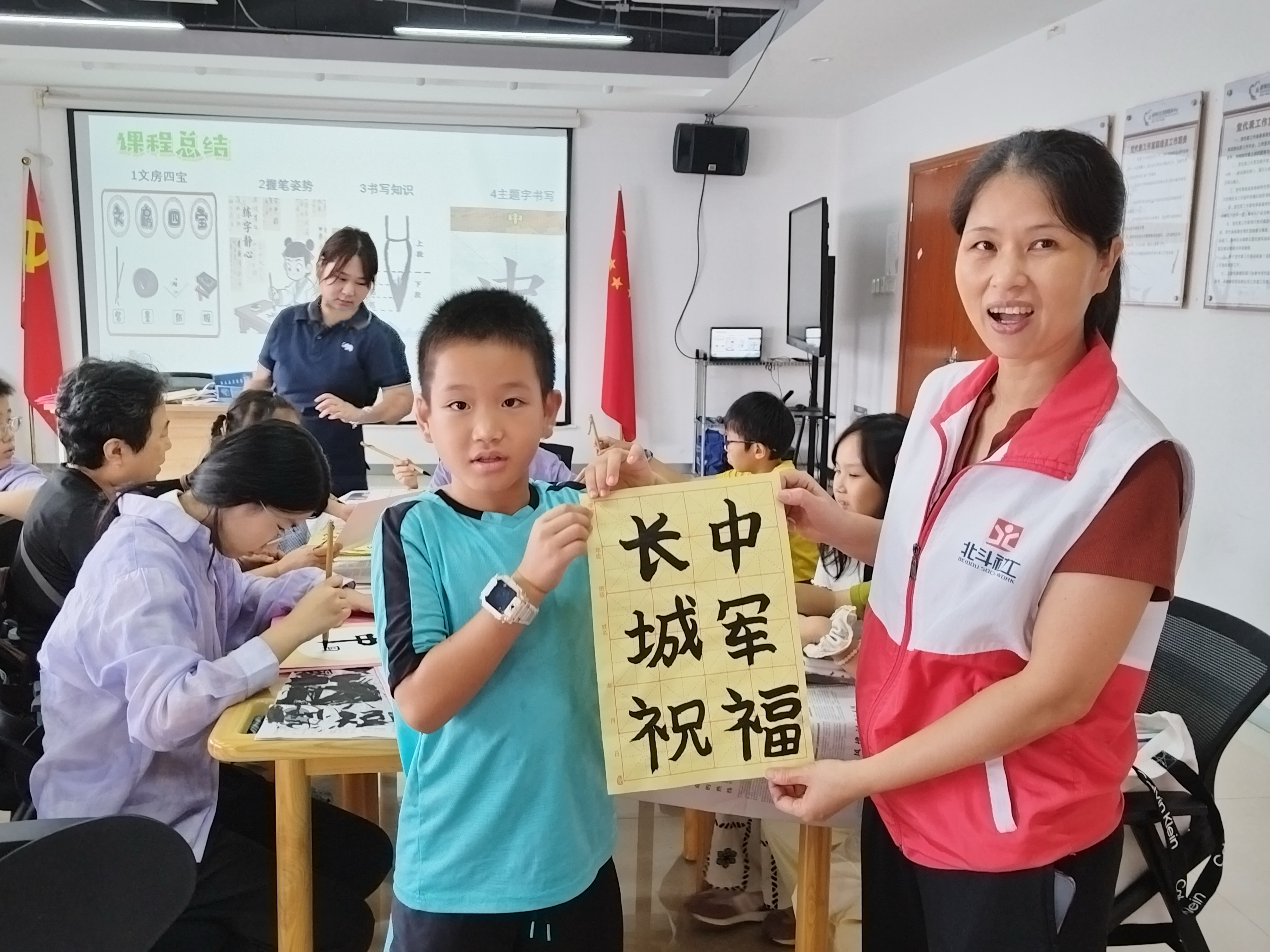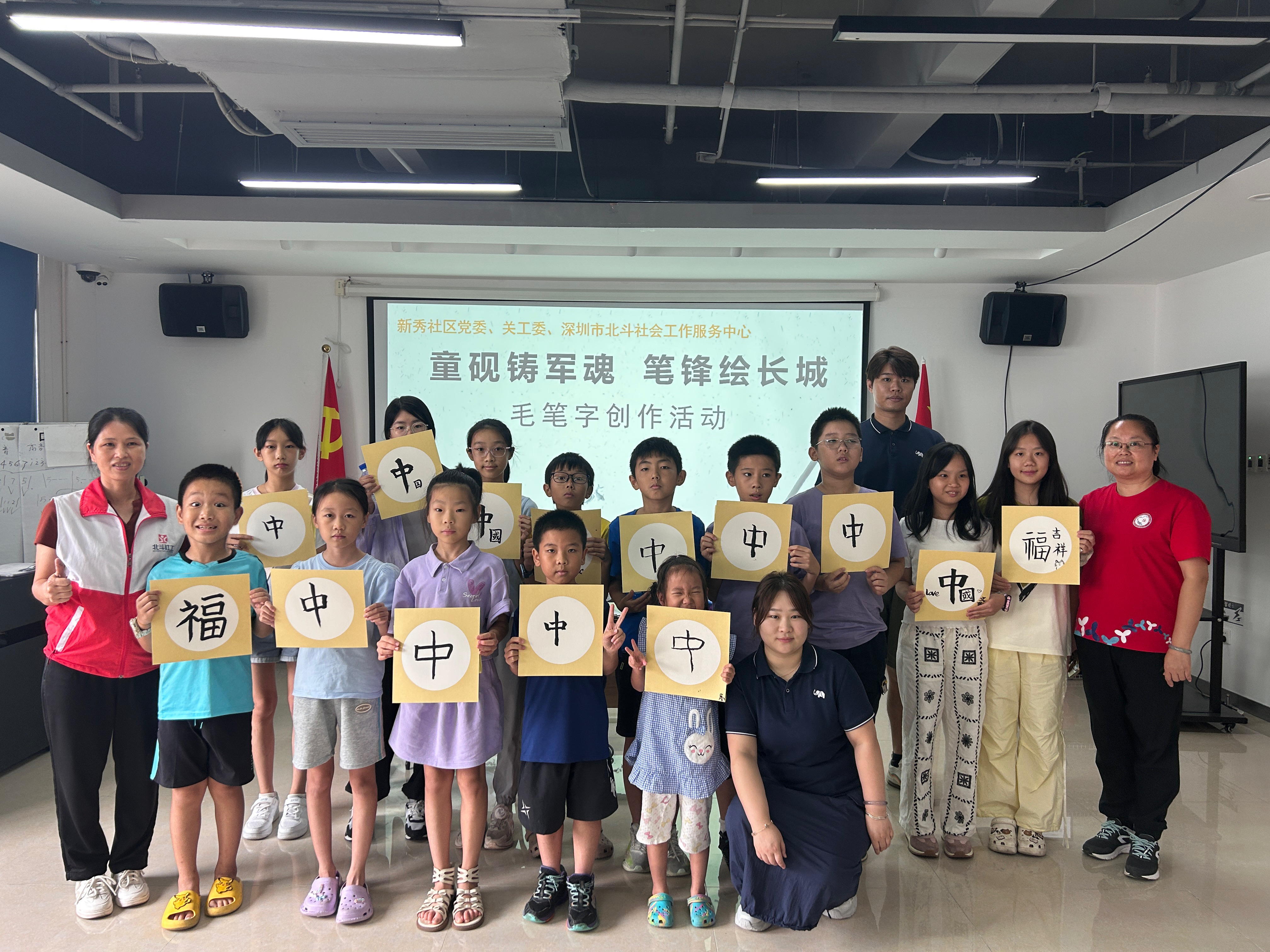 8 月 1 日下午,在新秀社区党委的引领下,新秀社区党群服务中心联合深圳市北斗社区工作服务中心开展了“童砚铸军魂・笔锋绘长城”毛笔字创作活动,15名社区儿童青少年在笔墨香中沉浸式体验传统文化,在专注书写中锻炼耐心与专注力。