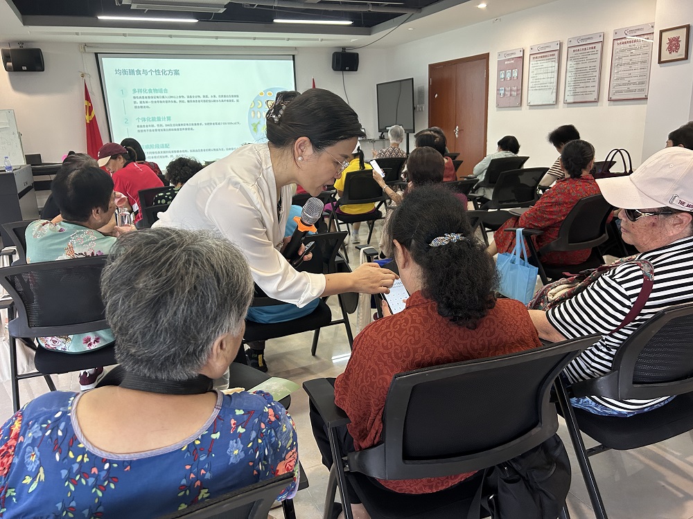 讲座伊始,老师围绕慢性病的定义、分类及当下流行趋势展开详细阐述。近十年,我国慢性病患病率近乎翻倍,65岁以上人群患病率高达62.33%,且呈年轻化态势,在此情形下,科学膳食成为预防慢性病的关键。为凸显营养干预重要性,老师通过生动实例,剖析不良饮食习惯与慢性病的紧密联系,让长者明晰饮食对健康的重大影响。谈及干预原则,老师强调均衡膳食与个性化方案,建议长者每日摄入不少于12种食物,依自身年龄、体重、活动量及疾病状况确定能量需求,还以表格形式呈现各类营养素的摄入量、功能与优质来源。针对高血压、糖尿病、肥胖症等常见慢性病,老师给出实用营养管理方案:高血压患者每日食盐摄入量控制在6克以下,采用DASH饮食模式;糖尿病患者定量分餐,优选低糖食物;肥胖症患者通过阶梯式热量控制及高蛋白、低碳水饮食实现能量平衡。讲座尾声,老师贴心分享了三日健康食谱,提醒长者注意日常饮水、用油等细节。饮食调整须与健康生活方式相结合,且绝不能替代药物治疗。