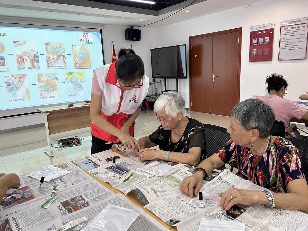 随后的手工实践环节氛围热烈,社工提前为参与者备好螺钿手工发簪、胸针的制作材料与工具,并手把手演示裁剪螺钿片、精准粘贴、牢固固定等步骤。长者们兴致盎然地动手尝试,遇到难题时互相交流技巧、互帮互助,在专注的创作过程中,不仅锻炼了手部精细协调能力,更通过色彩搭配、造型设计活跃了思维,真正实现了“以手工促认知”的活动目标。当一件件精致的螺钿发簪、胸针完成时,长者们脸上洋溢着满满的成就感。