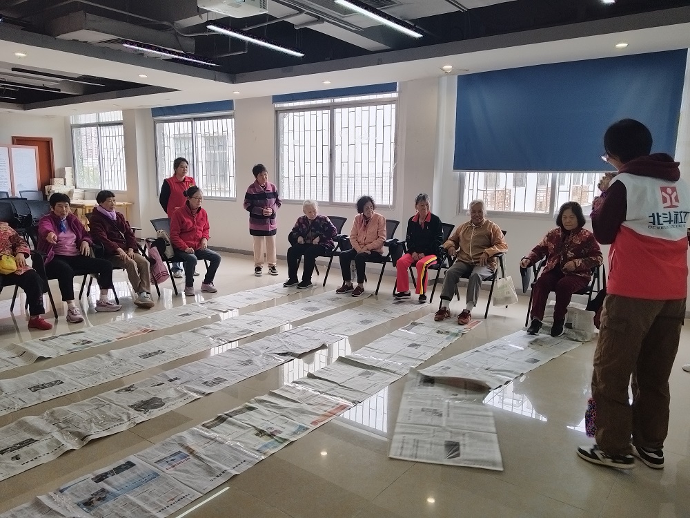 活动伊始,社工向长者们详细介绍了活动目的、流程及安全注意事项,着重讲解了适度运动对预防脑退化的重要意义,让长者们了解到“身体棒→大脑灵”的良性循环。随后的破冰游戏“十指歌”瞬间点燃现场氛围,长者们跟着社工的节奏,用手指做出点点、剪剪、弯弯等动作,在轻松互动中放松身心。