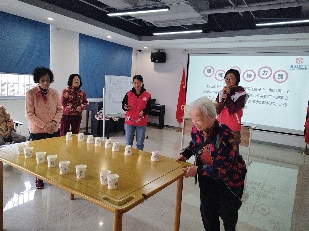 趣味运动环节是本次活动的核心亮点。长者分为三组,依次参与了报纸跑酷、舒尔特方格游戏、翻纸杯接力赛三个精心设计的项目。报纸跑酷锻炼肢体协调与反应力,舒尔特方格游戏聚焦数字敏感度与专注力、翻纸杯接力赛则注重团队协作与手部精细动作,每个项目都适配长者生理特点,既有趣味性又无强度压力。比赛中,长者们精神饱满、默契配合,活动现场掌声、笑声此起彼伏。各组队员相互鼓劲,充分展现了“友谊第一、比赛第二”的良好氛围,不少长者在协作中结识了新朋友,现场暖意融融。