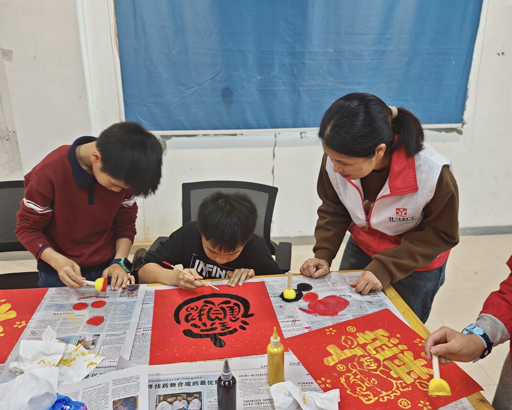 拓印年画挂历制作环节中,孩子们用富有年节寓意的传统拓印模板,在社工的示范下,全身心投入拓印创作。制作过程中,社工关注每位参与者的状态,对出现注意力分散的儿童及时给予温馨引导,帮助他们快速回归任务;对于能持续专注完成操作、认真打磨作品的孩子们,则及时给予积极肯定与正向鼓励,增强其自信心与成就感。现场氛围温馨而专注,在孩子们的精心拓印下,一幅幅童趣盎然的年画、一张张独具特色的新年挂历渐渐成形、熠熠生辉,每一份作品都承载着孩子们的专注与期盼。