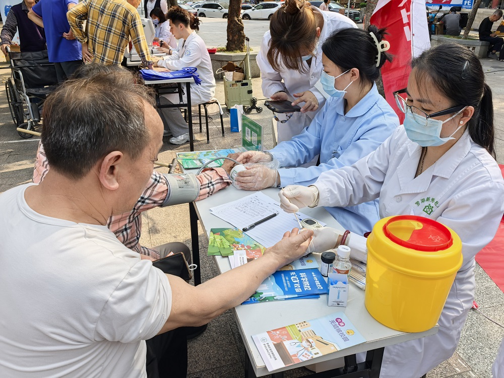 健康义诊摊位前居民有序排队,来自社康中心、口腔、眼科的医护志愿者为居民提供免费测血压、血糖、视力筛查、口腔检查、用药指导等便民服务。医护人员耐心细致问诊,针对中老年慢性病、春季常见病、口腔防护等问题给出科学建议,普及健康管理知识,把健康关怀送到居民身边,切实提升群众幸福感与获得感。