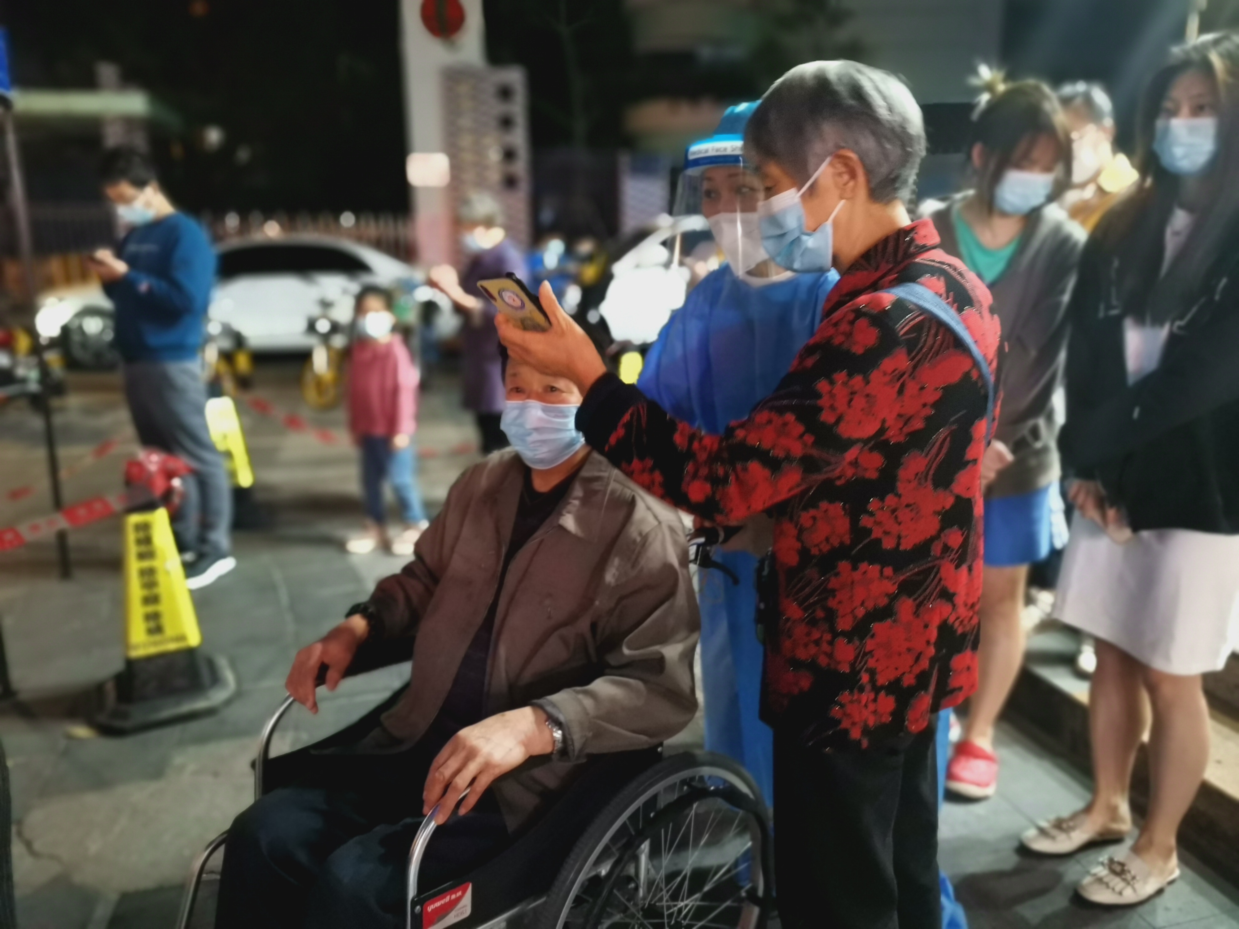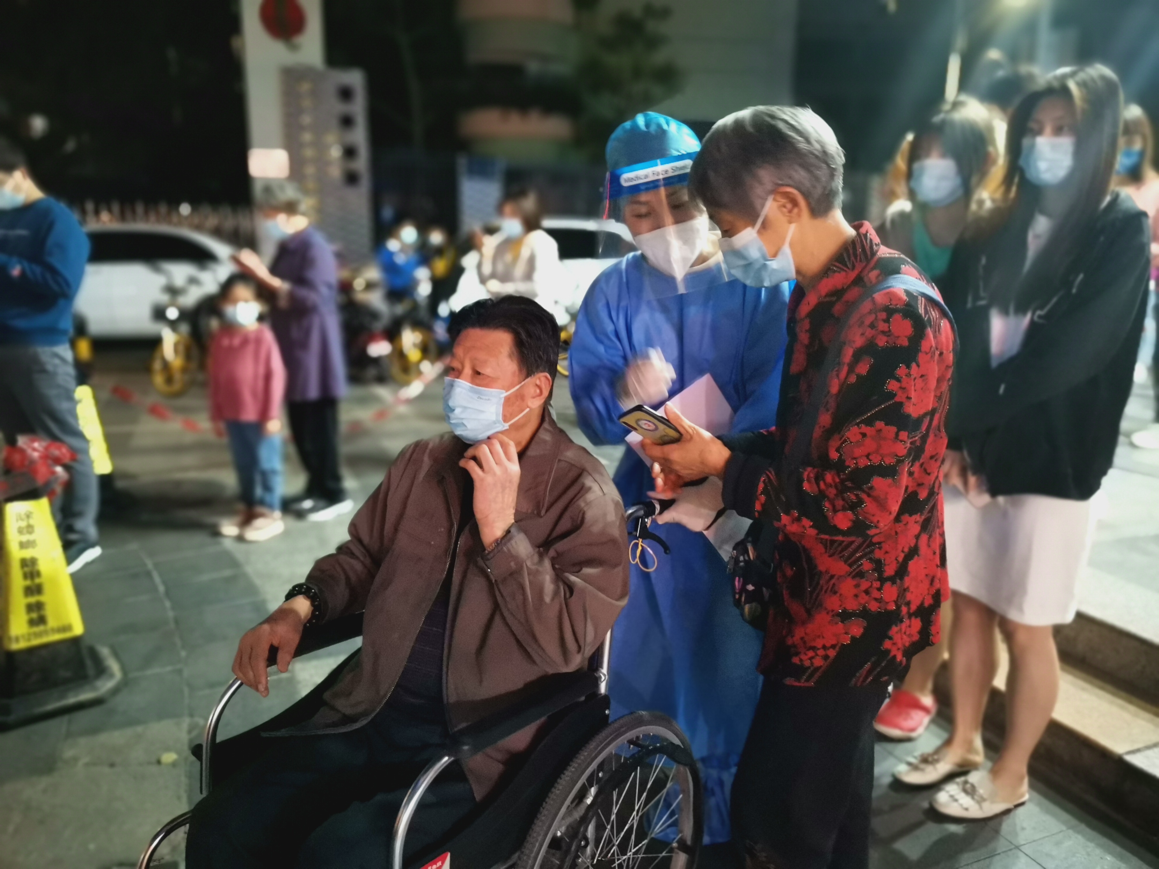 志愿者小心翼翼地推行动不便的老人去做核酸