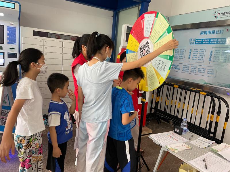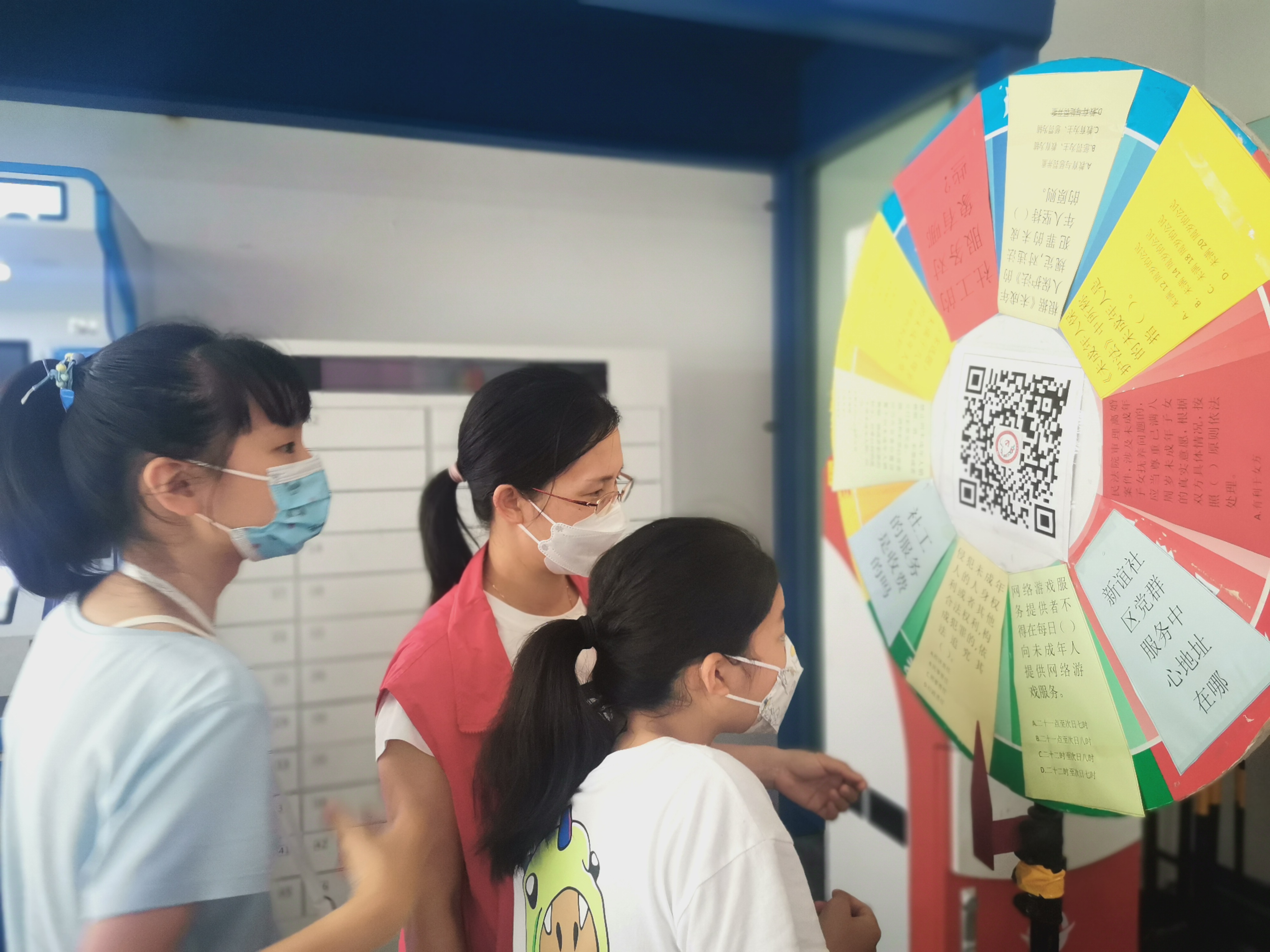 小朋友们在认真答题赚虚拟货币买东西 ——新谊开展儿童节快乐跳骚市场活动
