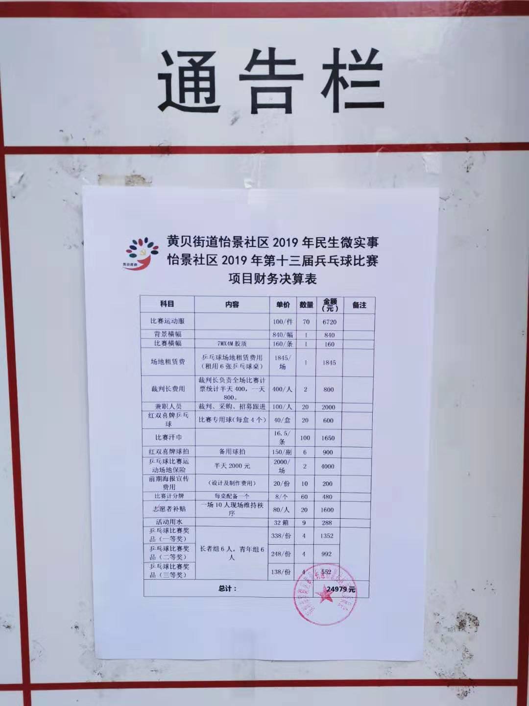 怡景社区2019年第十三届兵乓球比赛项目财务决算表