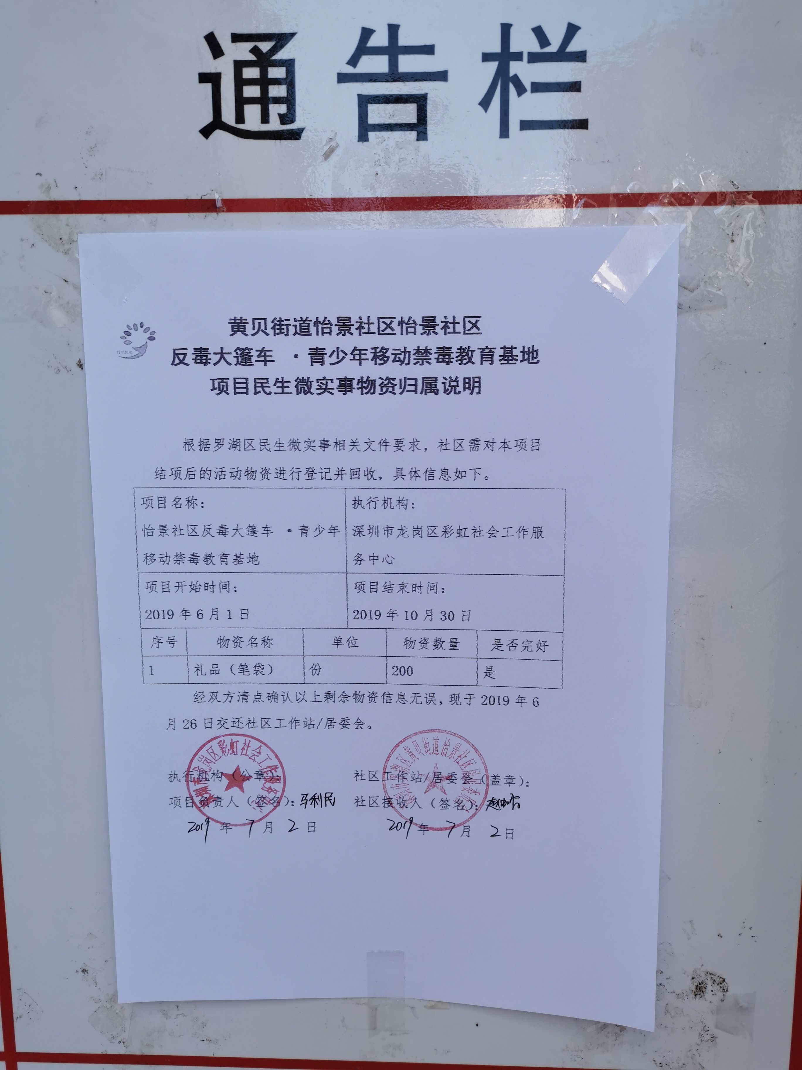 怡景社区2019年民生微实事怡景社区反毒大篷车 ·青少年移动禁毒教育基地项目物资归属情况公开