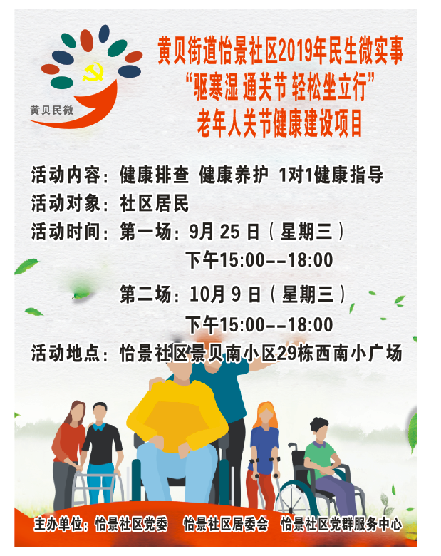 怡景社区2019年民生微实事“驱寒湿 通关节 轻松坐立行”社区老年人关节健康活动,第二场将于2019年10月9日下午在在怡景社区景贝南小区29东西南小广场开展,欢迎居民朋友们来参加活动!