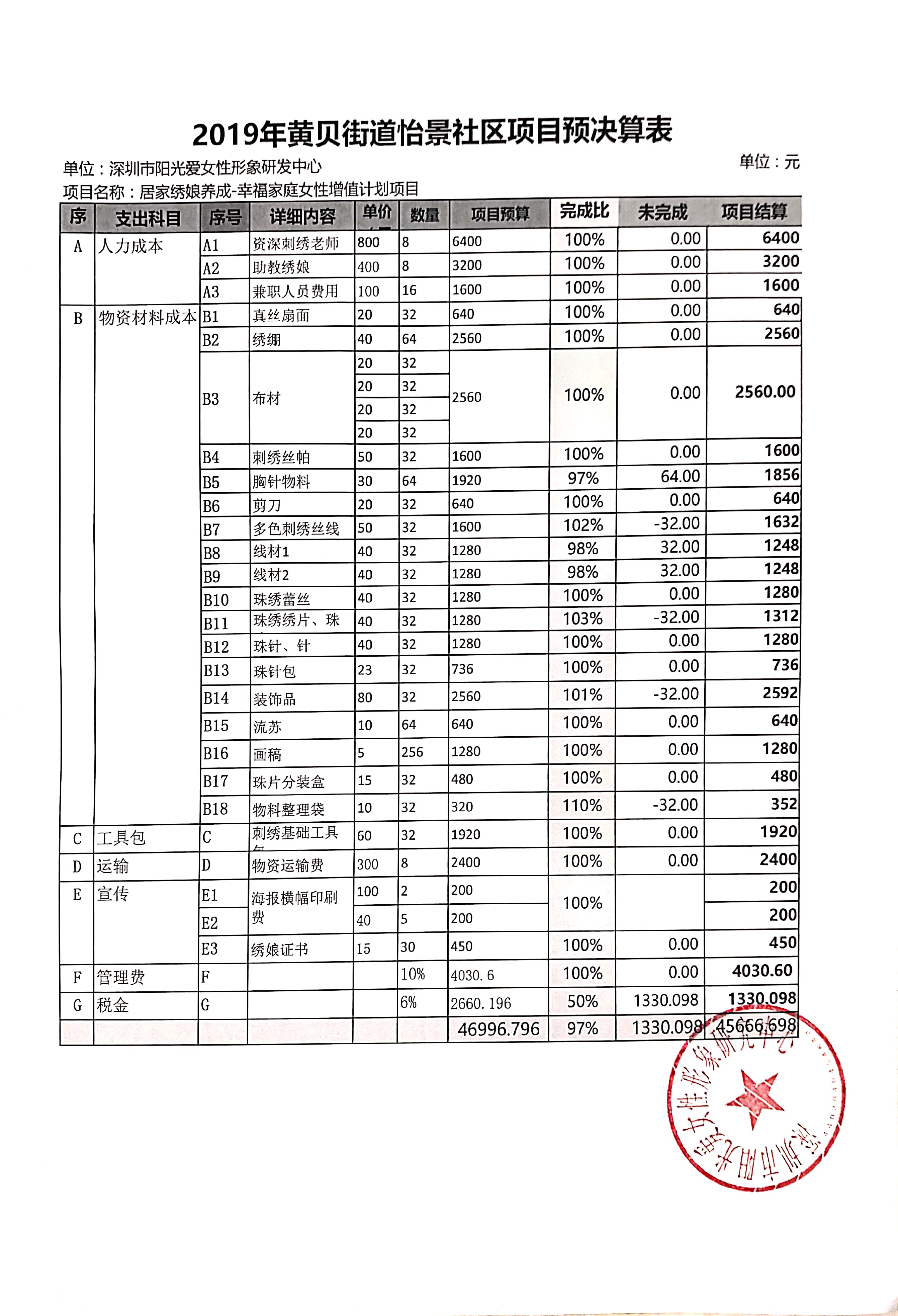 怡景社区2019年民生微实事项目居家绣娘养成--幸福家庭女性增值计划财务决算公示