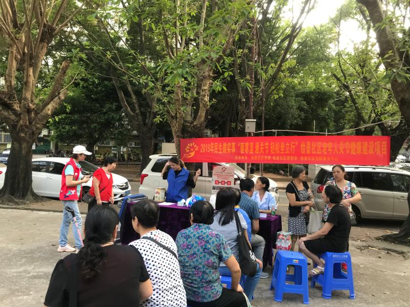 为落实党的号召全民健康,健康中国、健康深圳为目标,让健康文化进社区,普及宣传健康知识。2019年9月25日下午15:00--18:00,由罗湖区黄贝街道道怡景社区党委、怡景社区居委会、怡景社区党群服务中心开展2019年民生微实事“驱寒湿 通关节 轻松坐立行”社区老年人关节健康建设项目第一场活动,在怡景社区景贝南小区29东西南小广场顺利举行。