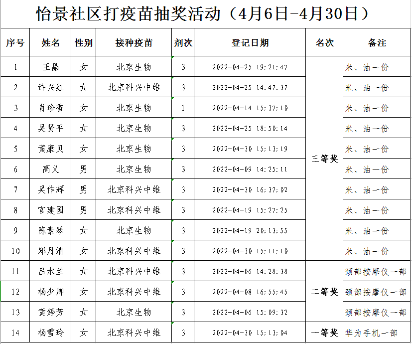 符合抽奖要求:202246日至2022430日期间在怡景社区社康接种加强针与60岁以上接种第一针的居民。