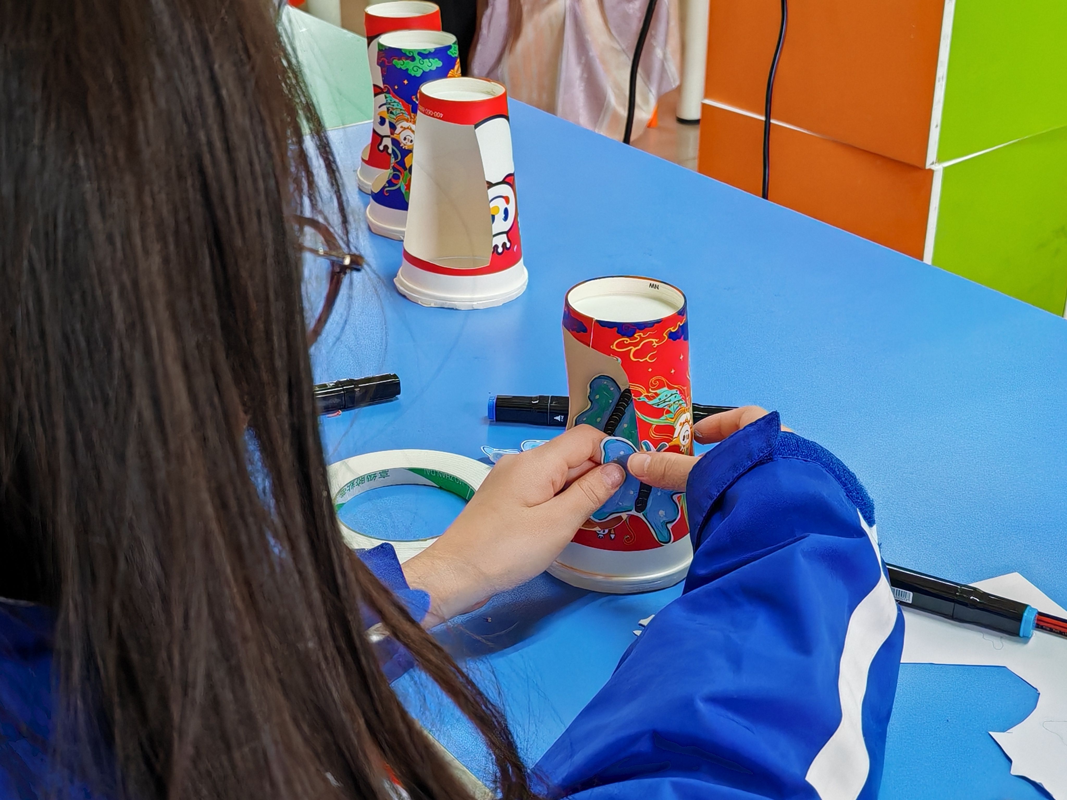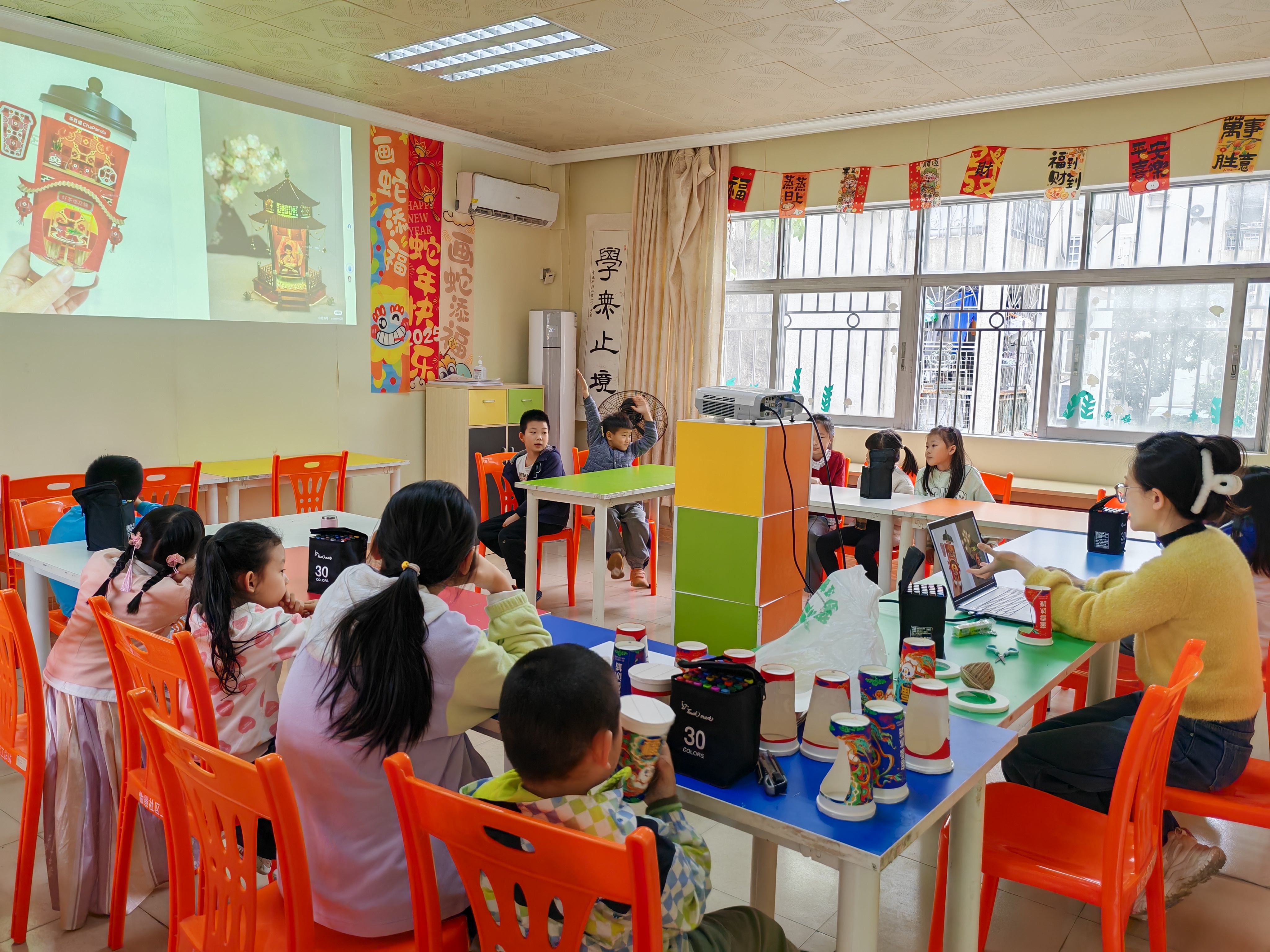 活动现场,老师先向孩子们介绍了奶茶杯再利用的意义以及制作氛围灯的基本步骤和安全注意事项。随着老师的一声令下,小朋友们迫不及待地动手操作起来。他们有的认真地在奶茶杯上描绘图案,有的小心翼翼地粘贴彩纸进行装饰,还有的忙着连接小灯测试灯光效果。在制作过程中,小朋友们充分发挥自己的想象力,将一个个普通的奶茶杯变成了各具特色的氛围灯作品。