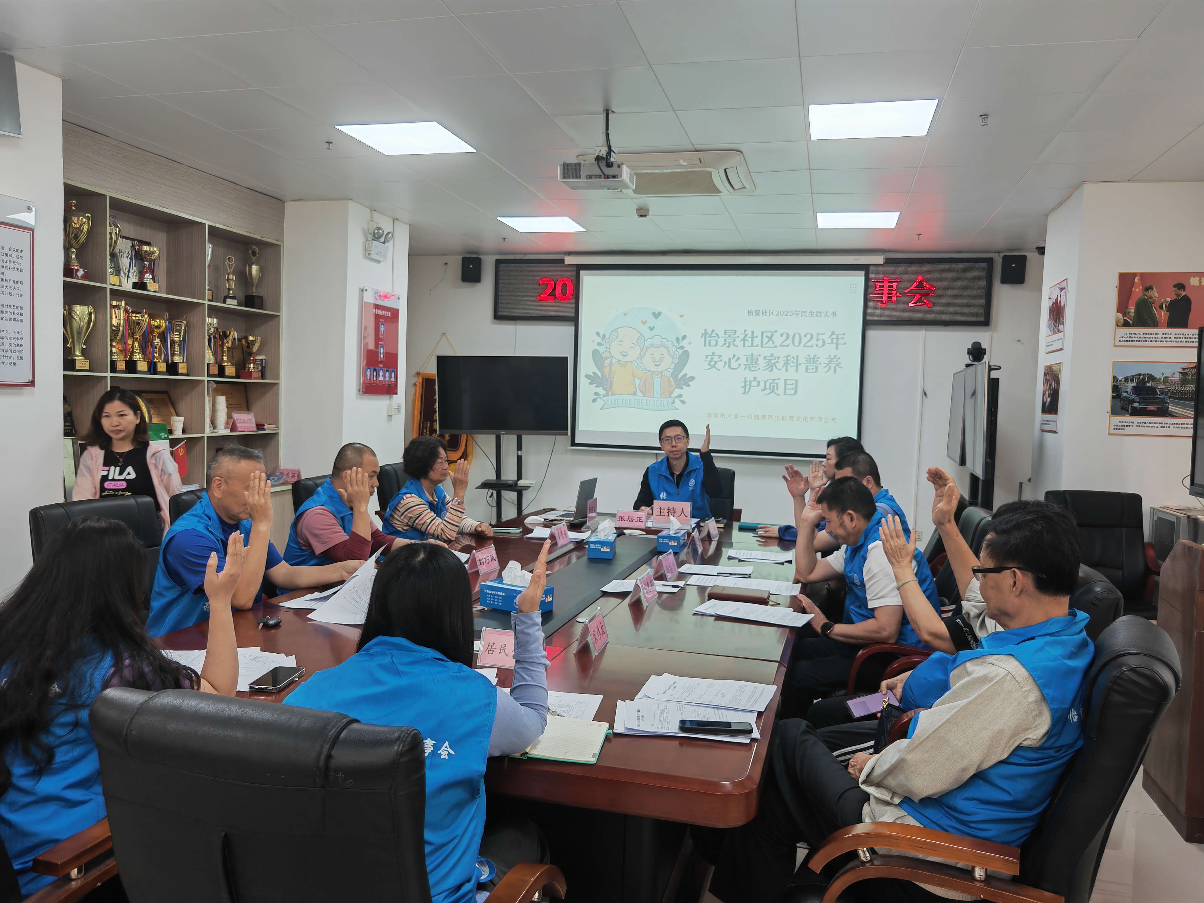三、审议关于《怡景社区2025年安心惠家科普养护项目》,会议审议了怡景社区工作站提交的项目申请。赞成大于反对(11:0),认为:该议案符合社区需要。会议议定:同意安排街道民微专项资金用于资助提案开展。