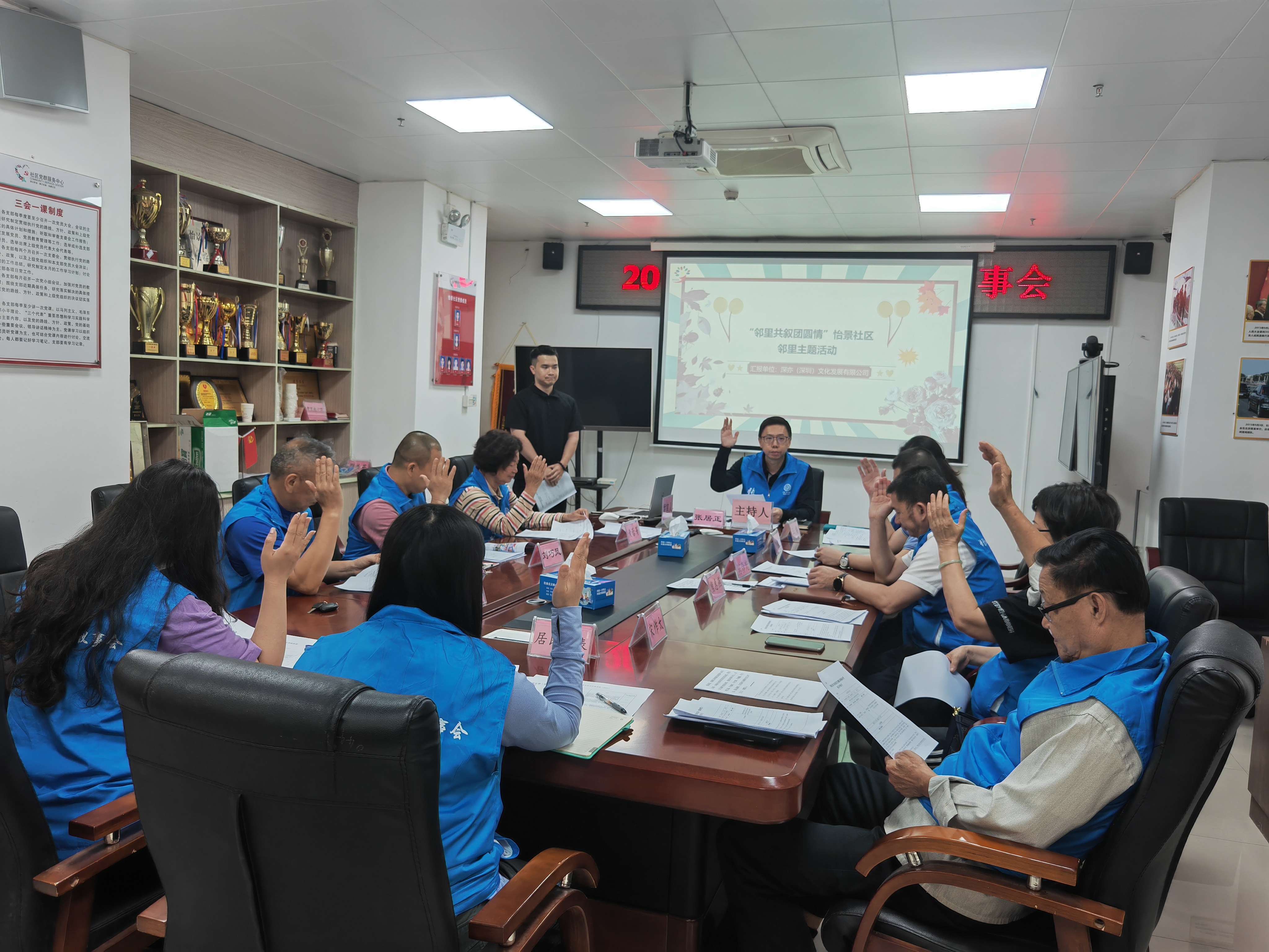 二、审议关于《“邻里共叙团圆情”怡景社区邻里主题活动》,会议审议了怡景社区工作站提交的项目申请。赞成大于反对(11:0),认为:该议案符合社区需要。会议议定:同意安排街道民微专项资金用于资助提案开展。