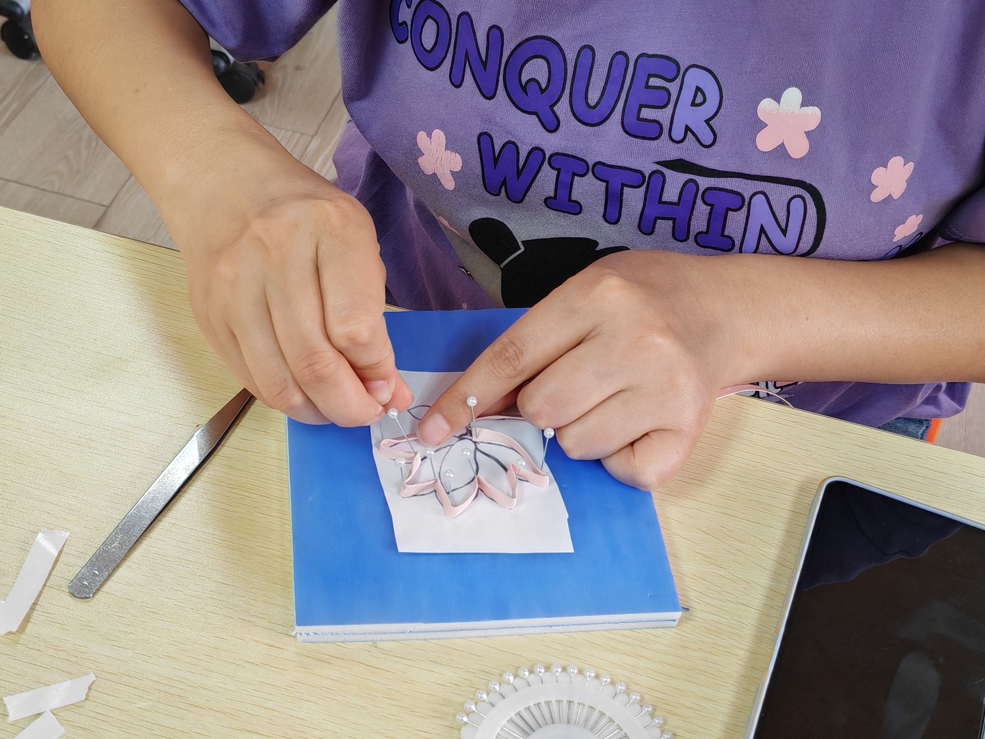 活动伊始,社工向参与者说明开展全职妈妈非遗技能项目的内容,让大家了解项目举办的初衷和意义。随后,由非遗传承人艺尘老师带领大家开启非遗盘扣的探索之旅,老师从盘扣起源、简介、种类等方面进行讲解,并展示精美图片,让大家领略到盘扣这一传统手工艺的独特魅力。在制作环节,老师细致教导制作步骤。美妈们认真学习,根据图示固定绕线、做记号缝制。尽管此次仅完成部分工序,但美妈们已然沉浸其中,对下节课的继续制作充满期待。