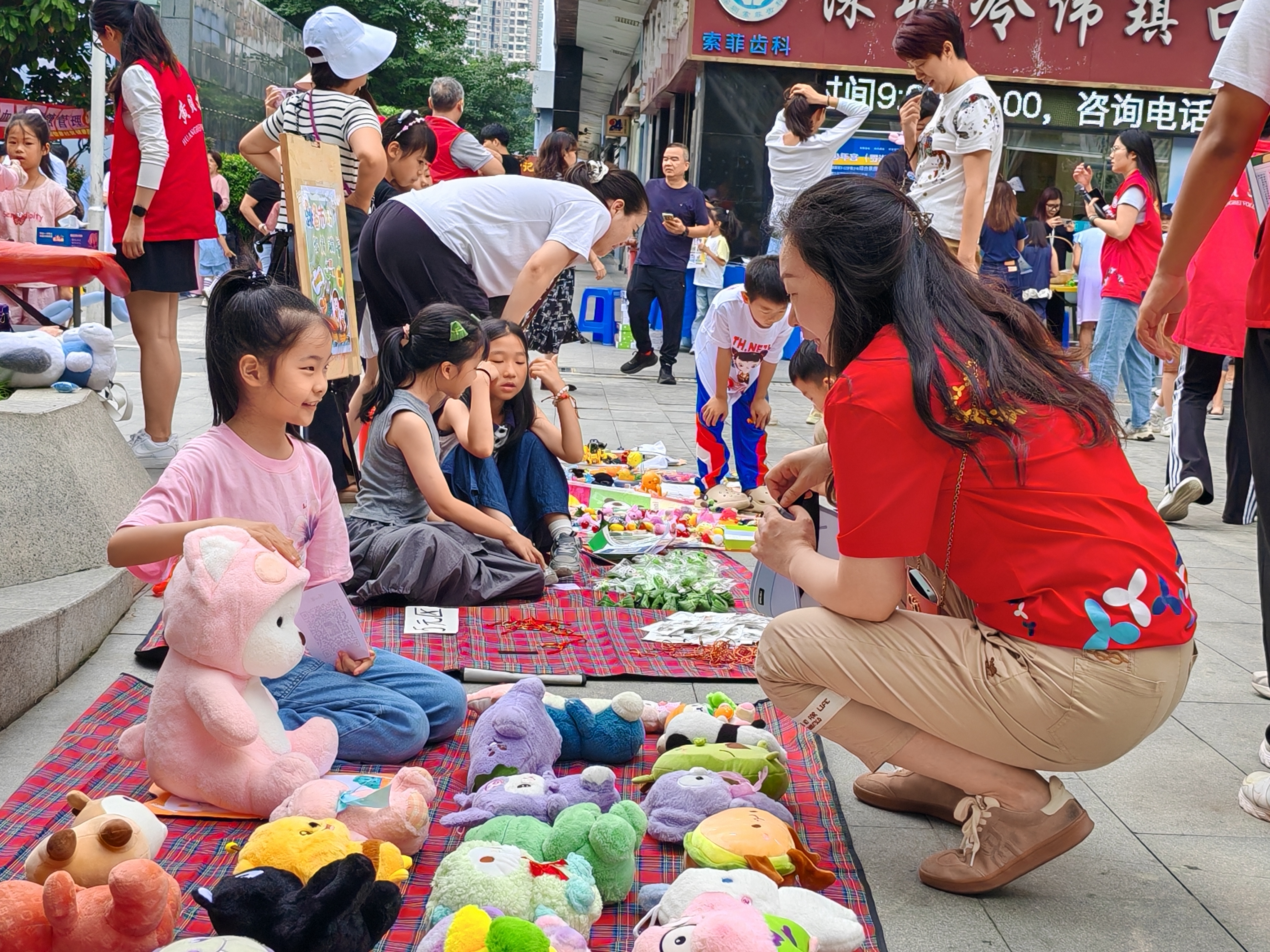 在亲子跳蚤市集区,亲子家庭在摊位前热情地介绍自家的儿童书籍、玩具、手工艺品等物品进行售卖或交换,在交易过程中不仅锻炼孩子们的沟通能力与理财意识,增加亲子的互动,更促进了邻里之间的交流互动,是社区党委倡导邻里和谐、共建温馨社区理念的生动实践。